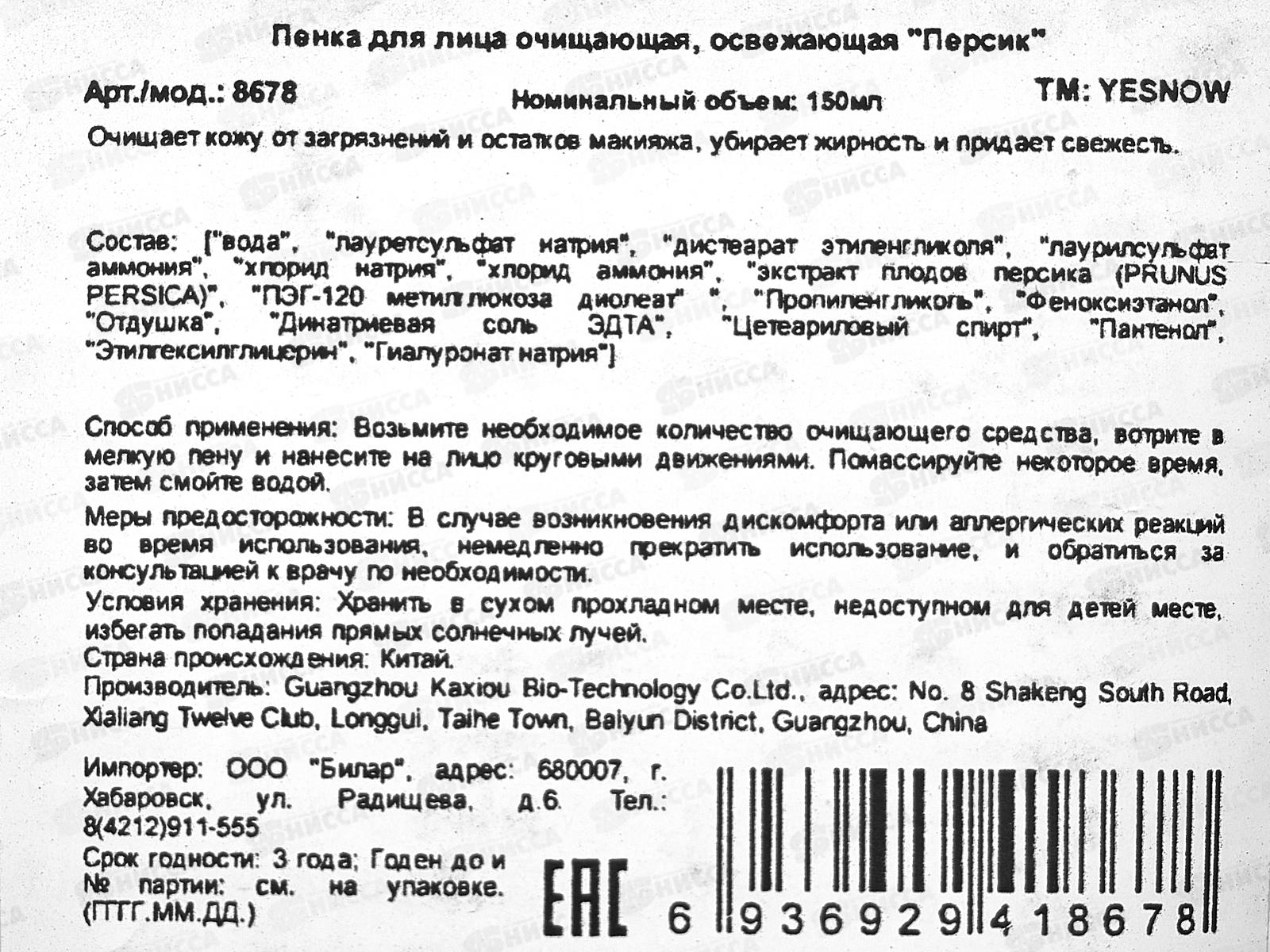 Yesnow Пенка для умывания очищающая освежающая Персик 150мл *72