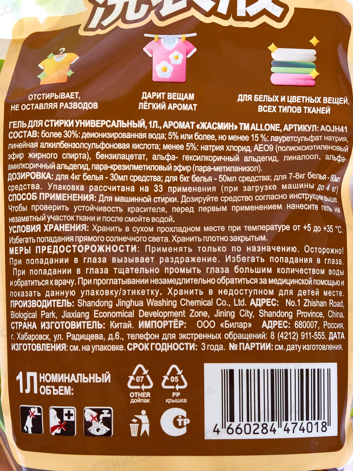 Allone гель для стирки 1л универсал для в/т/с Жасмин дойпак *12