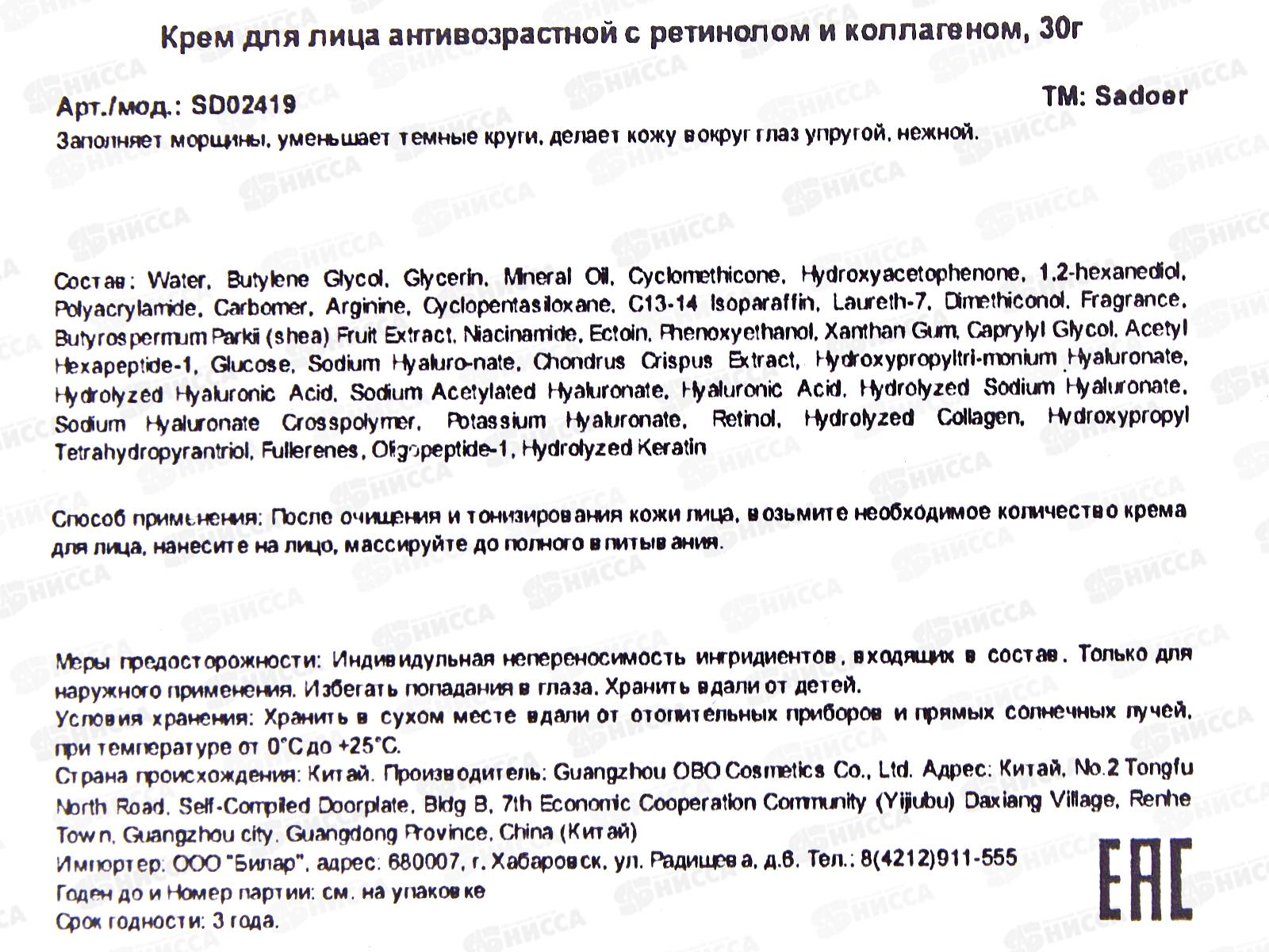 OBO Sadoer крем для лица Антивозрастной Коллаген Ретинол 30г *96