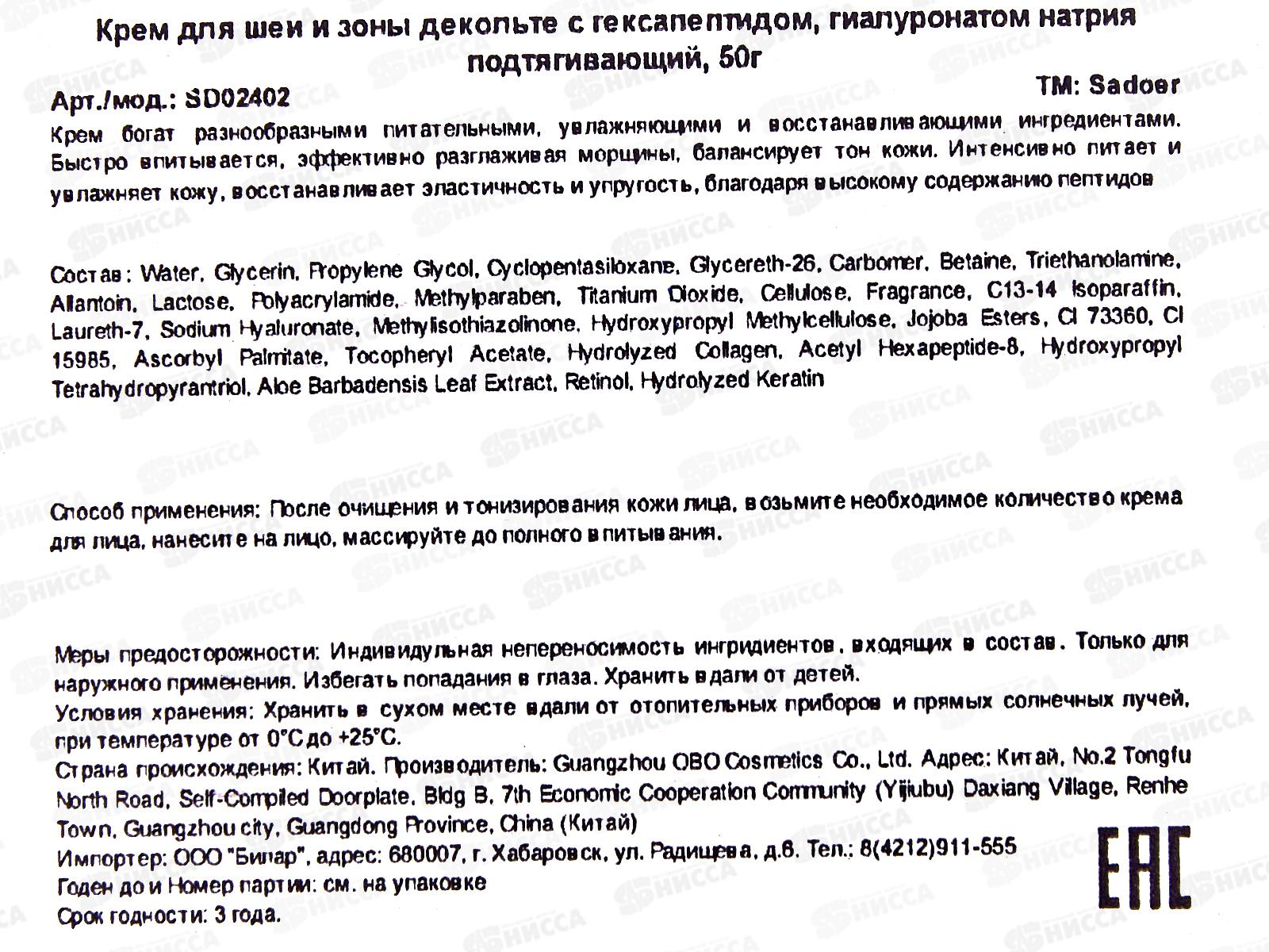 OBO Sadoer крем для лица Подтягив Гиалуронат Гексапептид 50г *96