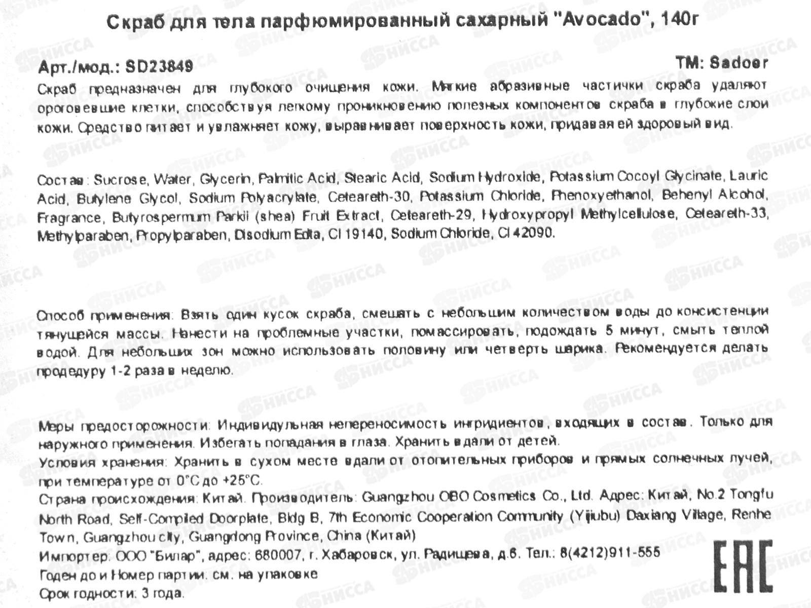 OBO Sadoer Скраб д/т сахарный Отшелушивающий Авокадо 140г *72