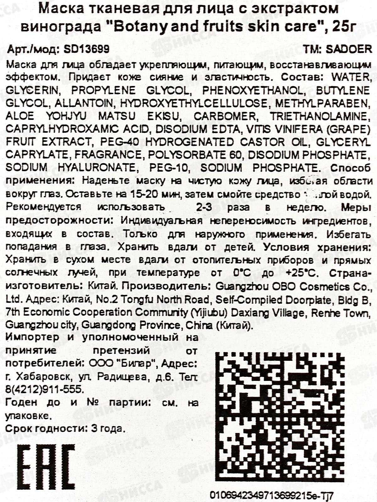 OBO Sadoer fruits маска тканевая для лица 25гр Виноград саше *1