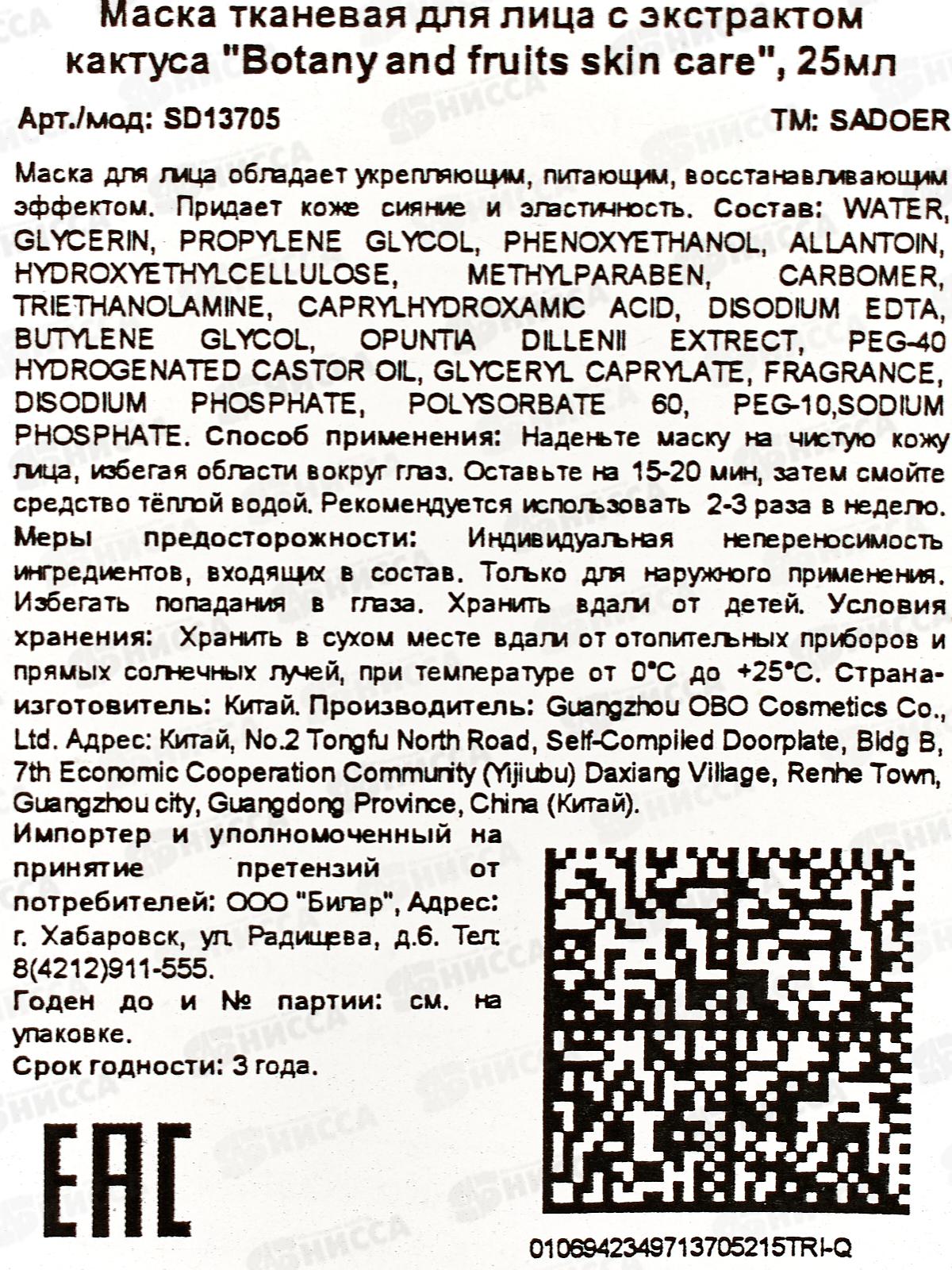 OBO Sadoer fruits маска тканевая для лица 25гр Кактус саше *1