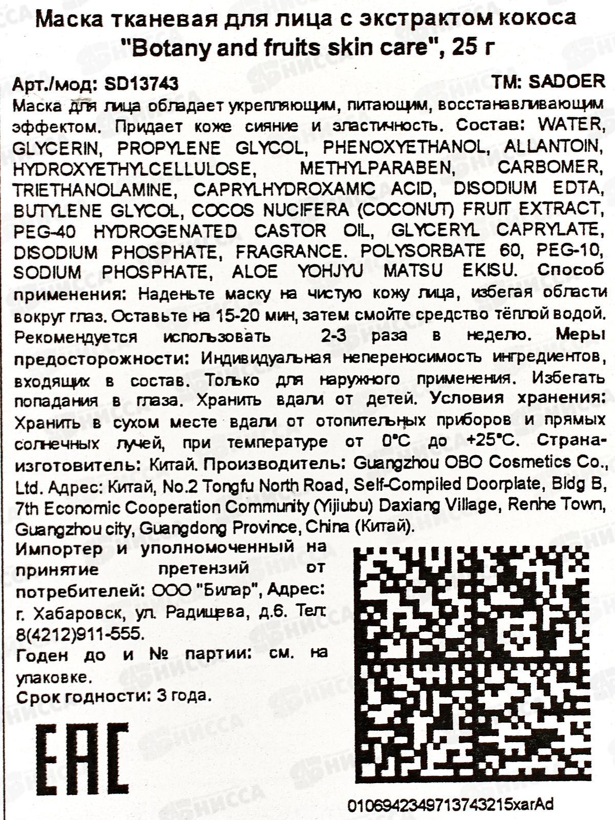 OBO Sadoer fruits маска тканевая для лица 25гр Экстракт кокоса саше *1