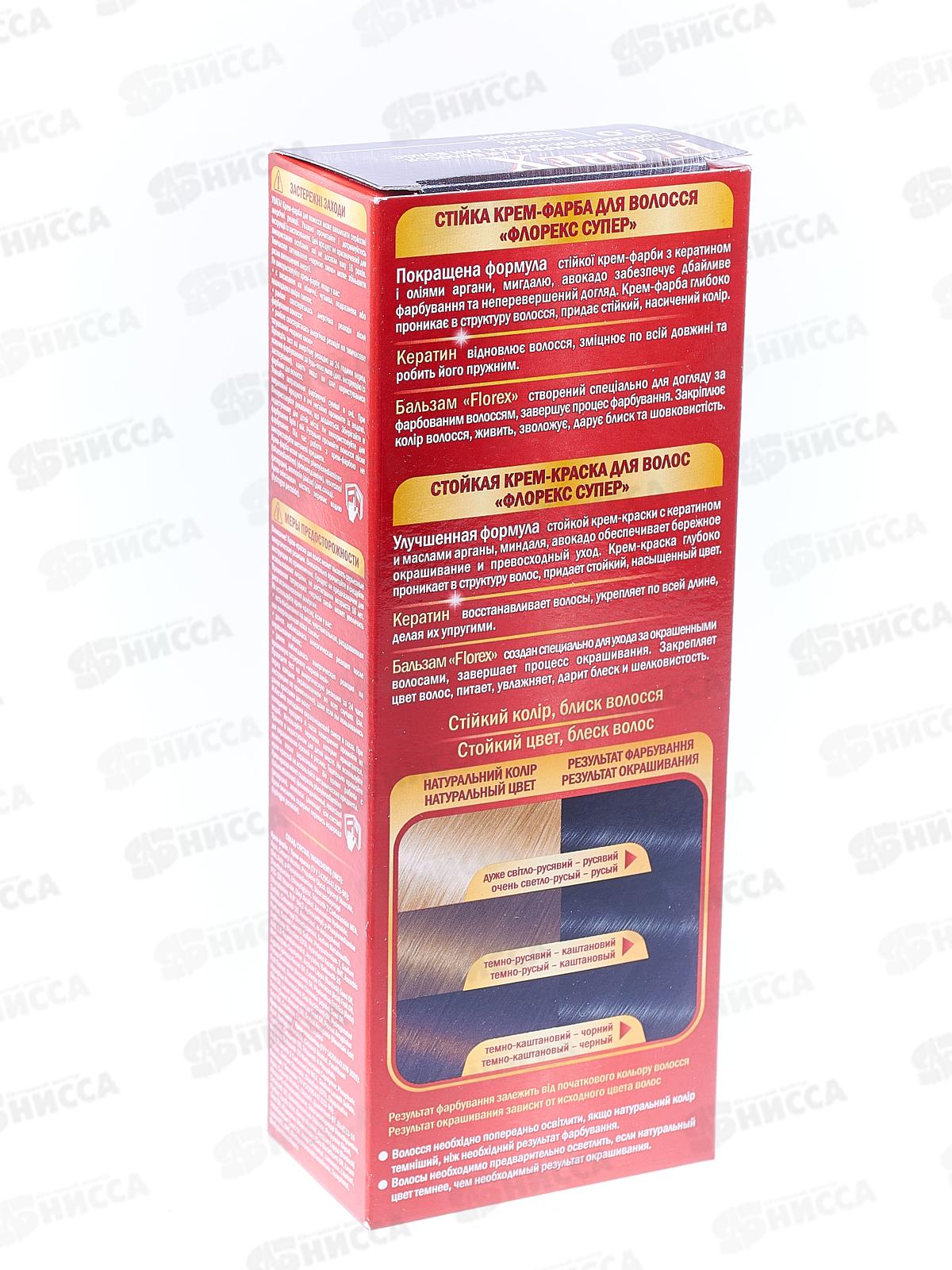 Стойкая крем-краска для волос Florex Super поможет получить желаемый цвет и ослепительный блеск локонов в домашних условиях. Формула краски содержит кератин, питательные масла миндаля, аргании и авокадо, богатые полезными микроэлементами. Активные вещества бережно ухаживают и укрепляют волосы от корней до кончиков. Бальзам Florex, идущий в комплекте, разработан для закрепления результата окрашивания. В его основе питательные и богатые витаминами натуральные экстракты льна, облепихи и репейника. Растительные компоненты ухаживают за волосами, увлажняя их, придают зеркальную гладкость, блеск и шелковистость. Красящие пигменты не повреждают корни и структуру волос, дарят равномерный, стойкий и насыщенный оттенок. Специальная формула полностью закрашивает седину. Краска Florex Super это длительный эффект и непревзойденный результат!