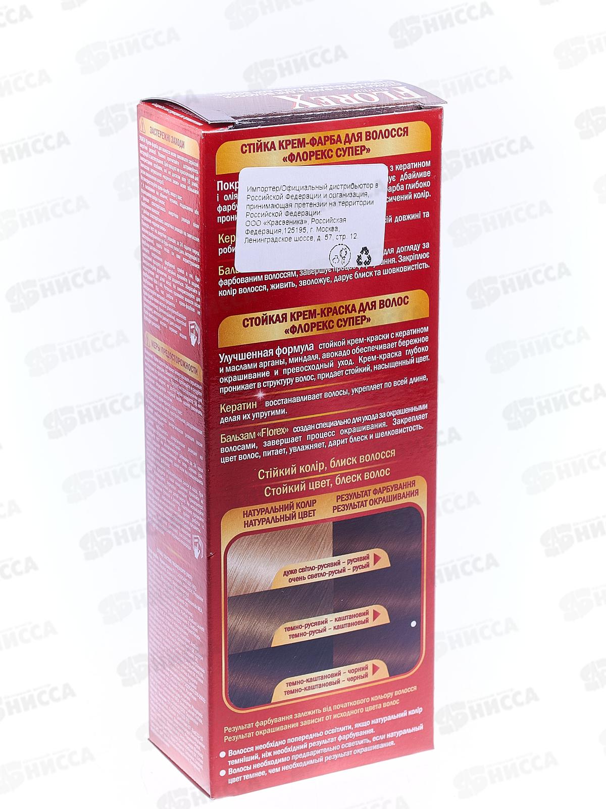 Стойкая крем-краска для волос Florex Super поможет получить желаемый цвет и ослепительный блеск локонов в домашних условиях. Формула краски содержит кератин, питательные масла миндаля, аргании и авокадо, богатые полезными микроэлементами. Активные вещества бережно ухаживают и укрепляют волосы от корней до кончиков. Бальзам Florex, идущий в комплекте, разработан для закрепления результата окрашивания. В его основе питательные и богатые витаминами натуральные экстракты льна, облепихи и репейника. Растительные компоненты ухаживают за волосами, увлажняя их, придают зеркальную гладкость, блеск и шелковистость. Красящие пигменты не повреждают корни и структуру волос, дарят равномерный, стойкий и насыщенный оттенок. Специальная формула полностью закрашивает седину. Краска Florex Super это длительный эффект и непревзойденный результат!