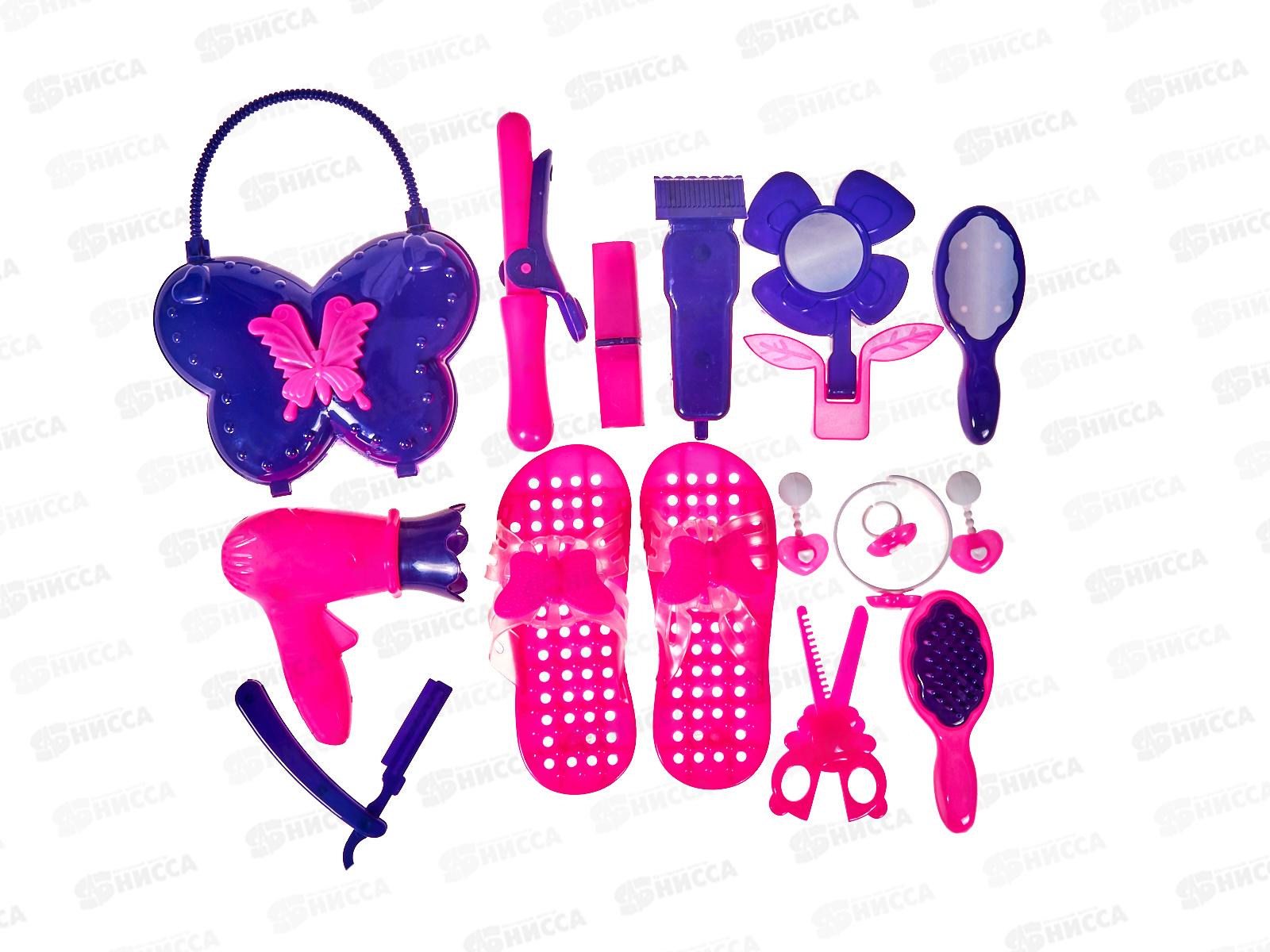 В комплект входят: фен, расческа, зеркало, машинка для стрижки, плойка, тапочки, 3 заколки, браслет, помада, ножницы, косметичка.Характеристики:Артику...