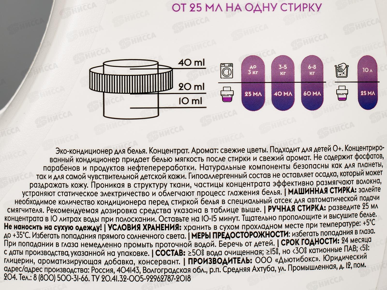 Концентрированный кондиционер придает белью мягкость после стирки и свежий аромат. Биоразлагаемые натуральные компоненты безопасны как для самой чувствительной детской кожи. Гипоаллергенный состав дерматологически протестирован, полностью выполаскивается и не оставляет осадка, который может раздражать кожу. Проникая в структуру ткани, частицы концентрата эффективно размягчают волокна, устраняют статическое электричество и облегчают процесс глажения белья. Средство подходит для стирки белого белья для хлопка, шерсти, вискозы, мембраны, ткани из синтетических волокон и др. видов цветных, и черных тканей. Используйте, добавляя к гелю, порошку, капсулам и к другим средствам для стирки. Не содержит фосфатов, парабенов и продуктов нефтепереработки. Состав: ?50% вода очищенная; ?15%, но <30% катионные ПАВ; <5%: глицерин, ароматизирующая добавка, консервант.