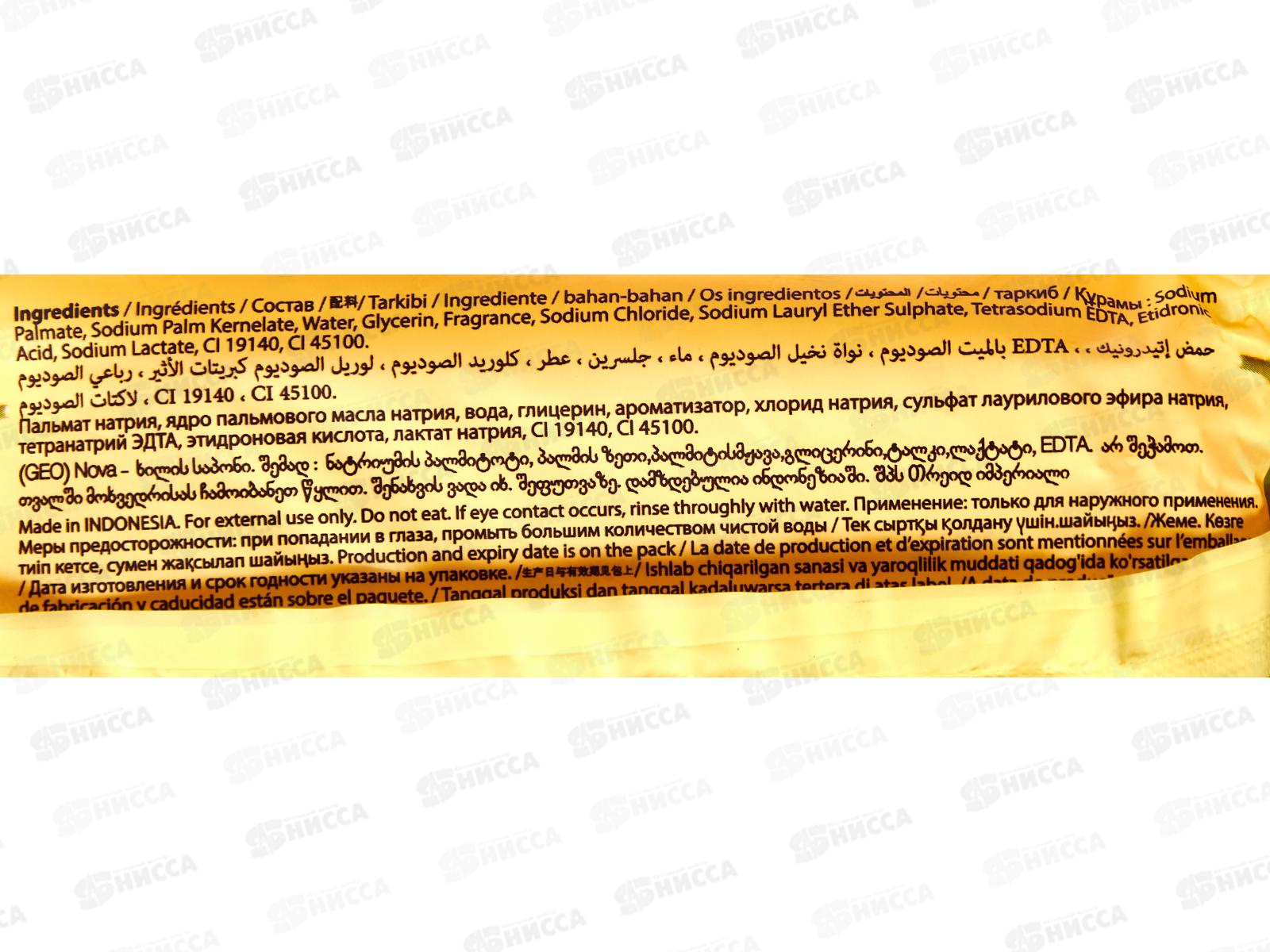 Состав: пальмат натрия, ядро пальмового масла натрия, вода, глицерин, ароматизатор, хлорид натрия, сульфат лаурилового эфира натрия, тетранатрий ЭДТА, этидроновая кислота, лактат натрия, Cl 19140, CI 45100.