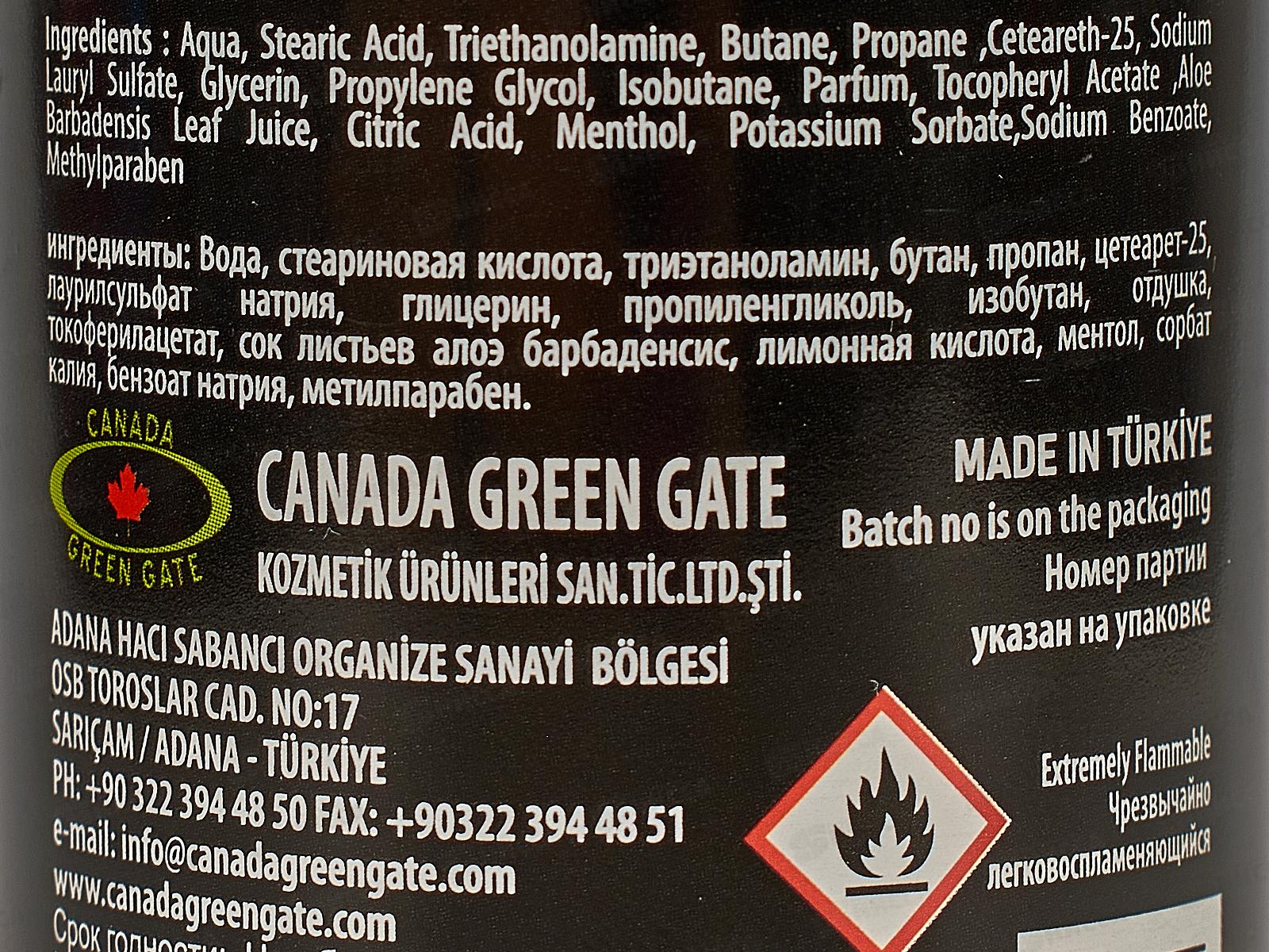 Состав: вода, стеариновая кислота, триэтаноламин, бутан, пропан, цетеарет-25, лаурилсульфат натрия, глицерин, пропиленгликоль, изобутан, отдушка, токоферилацетат, сок листьев алоэ барбаденсис, лимонная кислота, ментол, сорбат калия, бензоат натрия, метилпарабен.