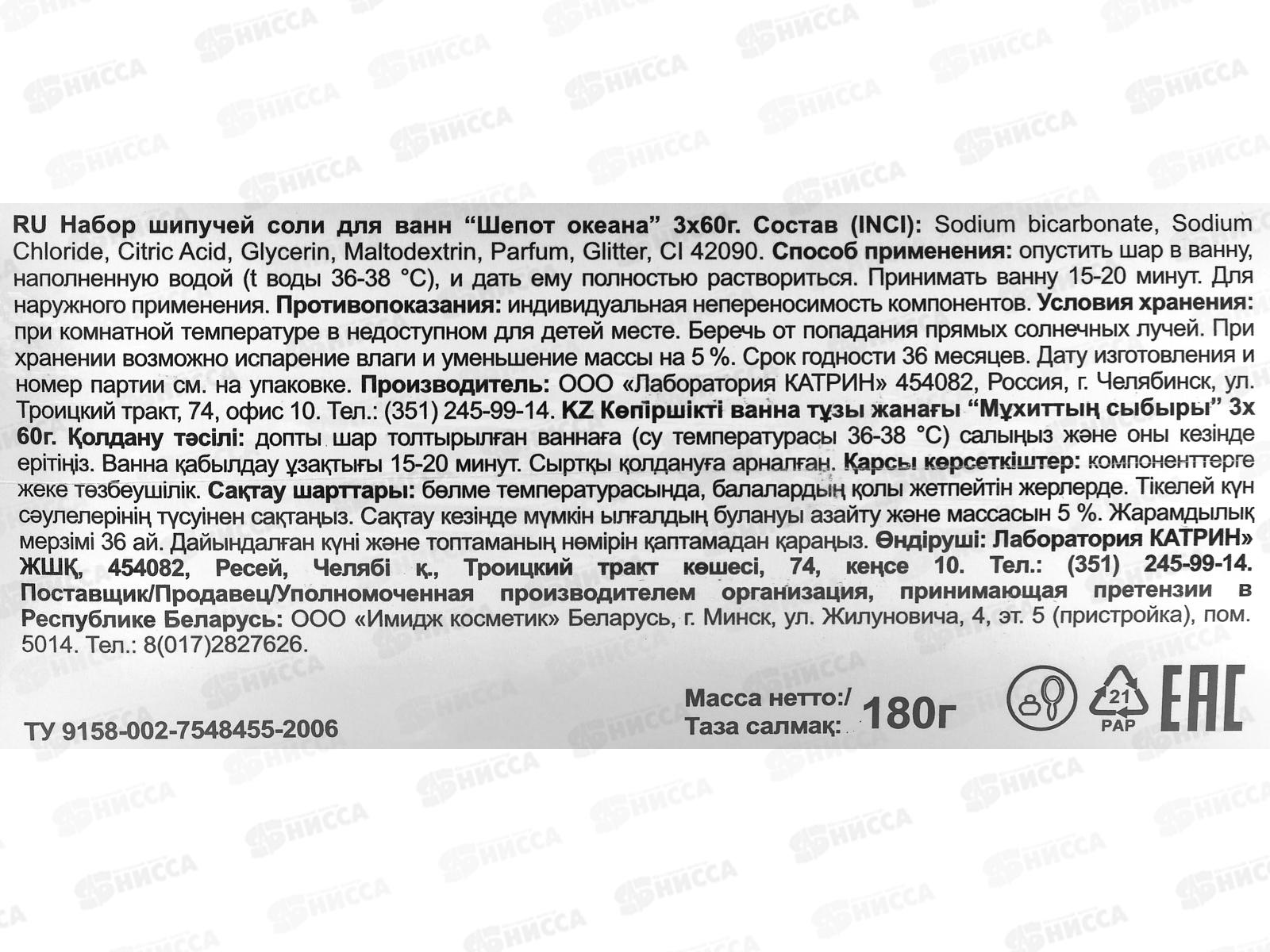 Состав: Бикарбонат натрия, хлорид натрия, лимонная кислота, глицерин, мальтодекстрин, парфюмерная композиция, блестки, CI 42090.