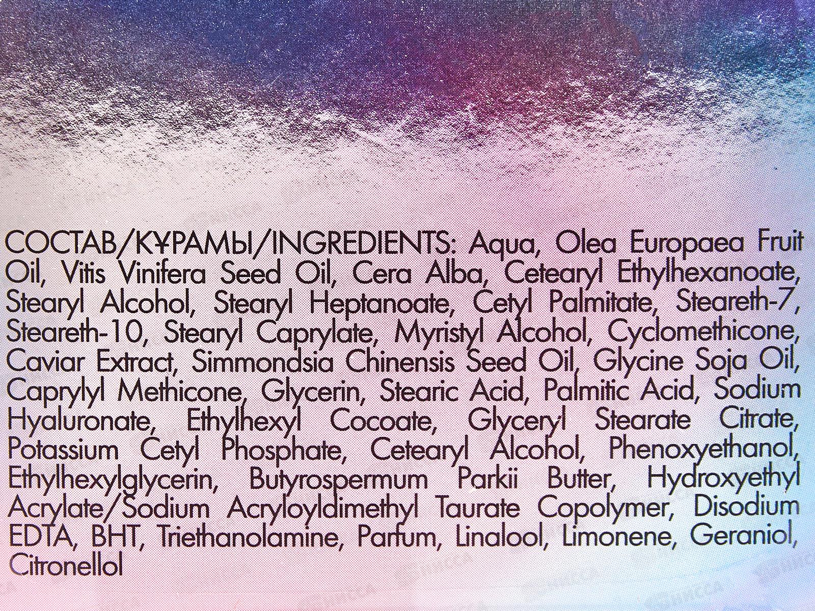Состав: вода, масло оливковое, масло виноградной косточки, воск пчелиный, цетеариловый этилгексаноат, цетеариловый спирт, стеарил гептаноат, цетилпальмитат, стеарет-7, стеарет-10, стеариловый каприлат, миристиловый спирт, циклометикон, экстракт черной икры, масло жожоба, масло соевое, каприлил метикон, глицерин, стеарин, гиалуронат натрия, этилгексил кокоат, глицерилстеарат цитрат, воск эмульсионный, феноксиэтанол с этилгексилглицерином, масло ши, сополимер гидроксиэтилакрилата и акрилоилдиметилтаурата натрия, трилон Б, бутилгидрокситолуол, триэтаноламин, парфюмерная композиция, линалоол, лимонен, гераниол, цитронеллол.