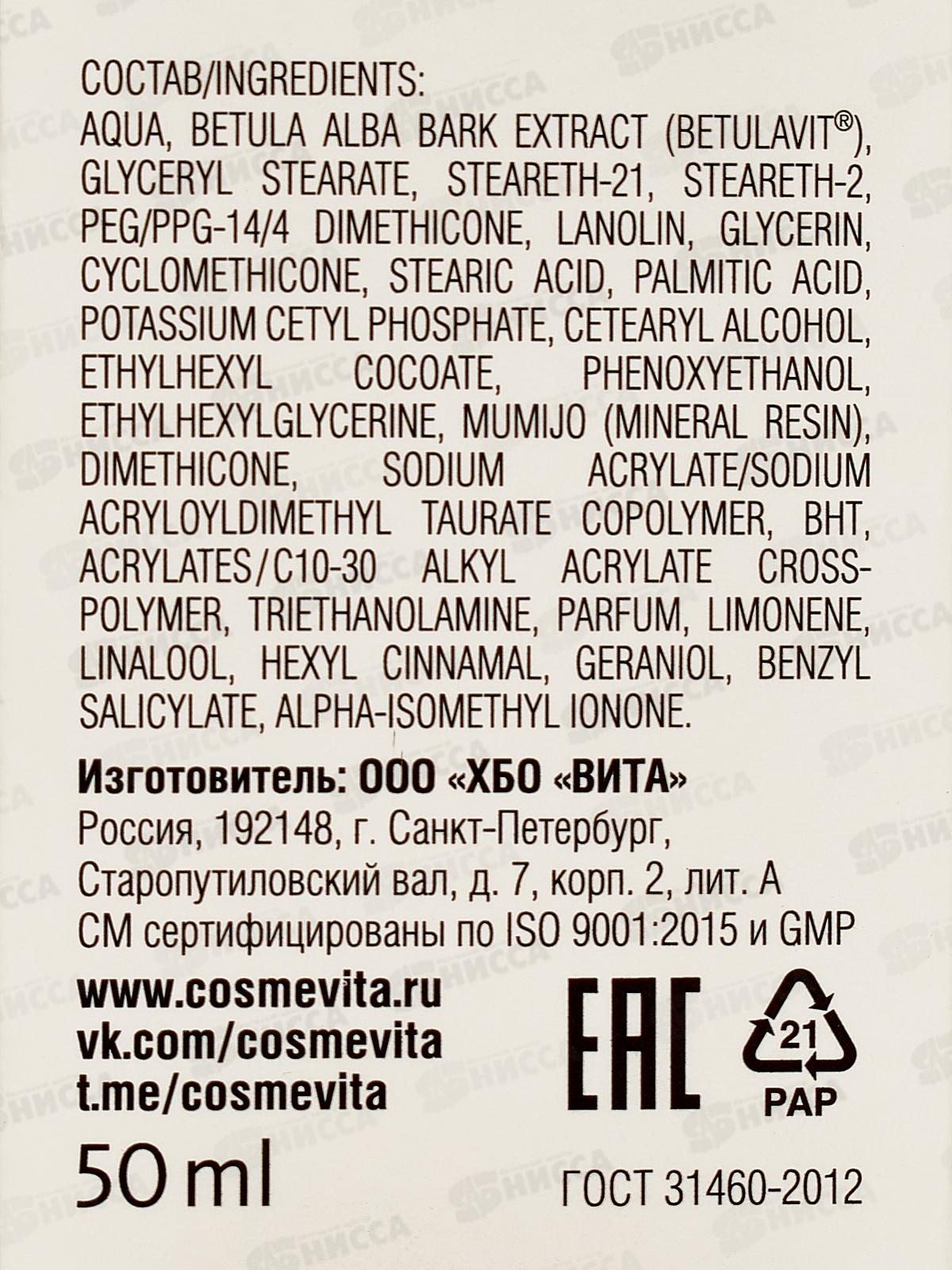 Состав: вода, экстракт коры березы белой (бетулавит®), глицерилстеарат, стеарет-21, стеарет-2, диметикон peg/ppg-14/4, ланолин, глицерин, циклометикон, стеариновая кислота, пальмитиновая кислота, цетилфосфат калия, цетеариловый спирт, этилгексилкоат, феноксиэтанол, этилгексилглицерин, мумие (минеральная смола), диметикон, сополимер акрилата натрия/акрилоилдиметилтаурата натрия, bht, перекрестный полимер акрилатов/алкилакрилатов c10-30, триэтаноламин, парфюм, лимонен, линалоол, гексилциннамал, гераниол, бензилсалицилат, альфа-изометилионон.