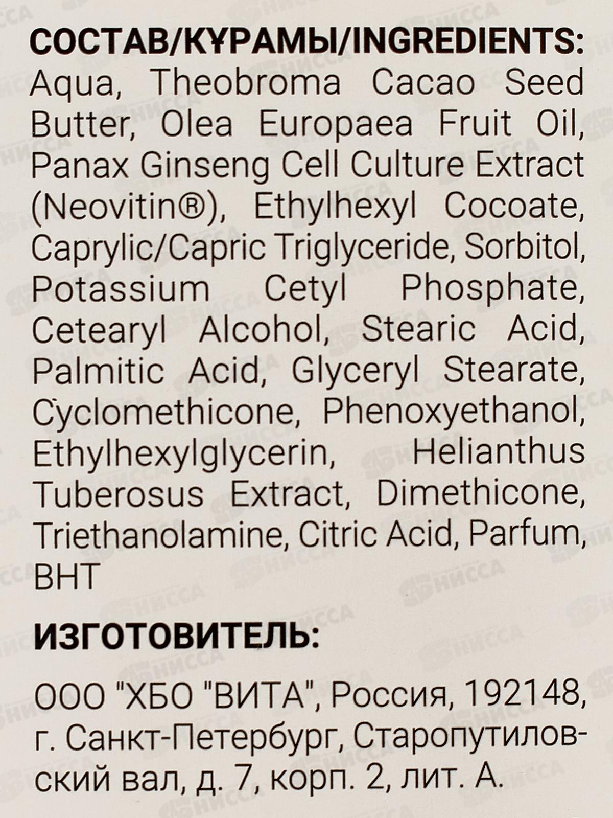 Состав: вода, масло семян какао-дерева, масло плодов оливы европейской, экстракт клеточной культуры женьшеня обыкновенного (Neovitin®), этилгексил кокоат, каприловый/каприновый триглицерид, сорбитол, цетилфосфат калия, цетеариловый спирт, стеариновая кислота, пальмитиновая кислота, глицерил стеарат, циклометикон, феноксиэтанол, этилгексилглицерин, экстракт подсолнечника клубненосного, диметикон, триэтаноламин, лимонная кислота, отдушка, BHT.