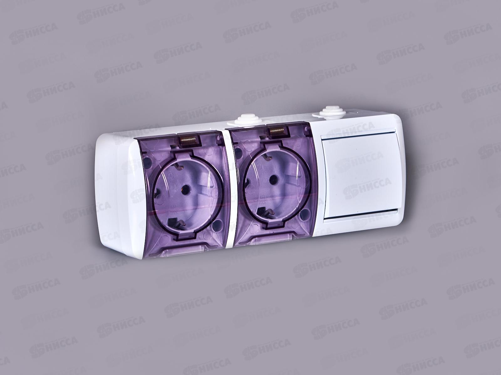 Код:557434; Блок горизонтальный КЛИО выкл. 1-кл, о/у + розетка 2-мес.с крышкой, с/з, 16А*10