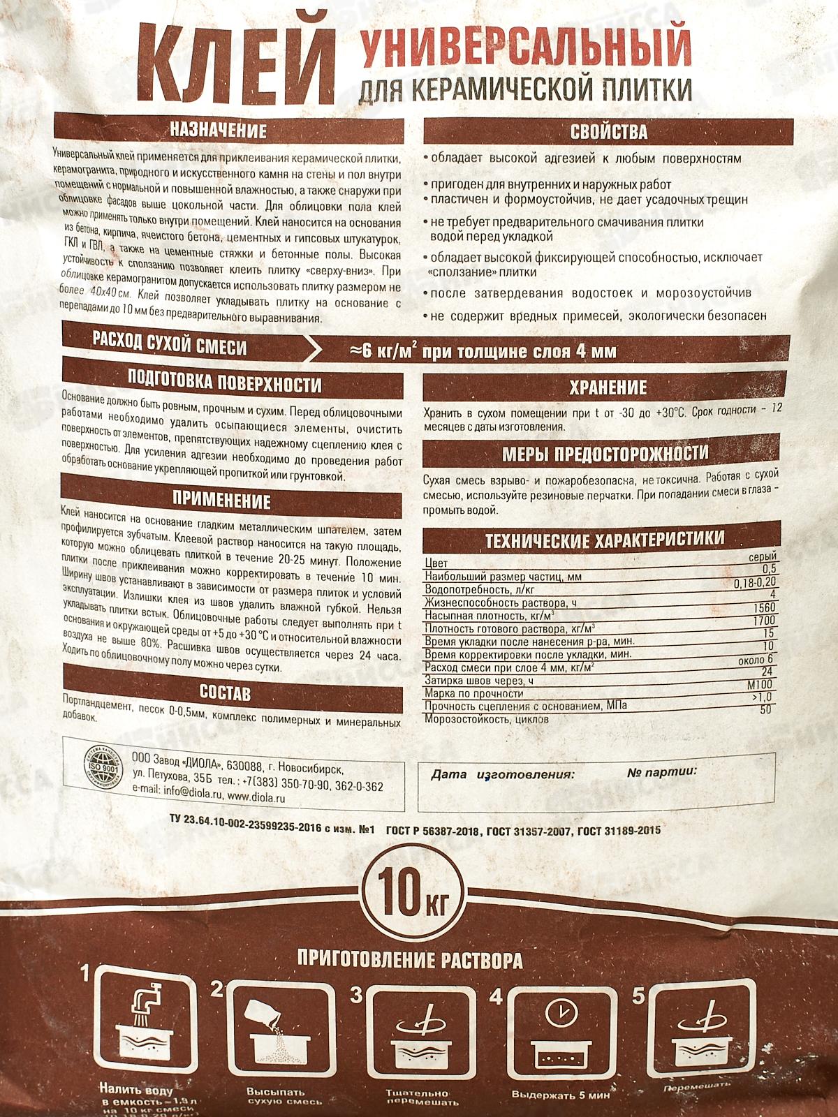 Применяется для приклеивания керамической плитки, керамогранита, природного и искусственного камня на стены и пол снаружи и внутри помещений с нормальной и повышенной влажностью. Клей наносится на основания из бетона, кирпича, ячеистого бетона, цементных и гипсовых штукатурок, ГКЛ и ГВЛ, а также на цементные стяжки и бетонные полы. Высокая устойчивость к сползанию позволяет клеить плитку «сверху-вниз». При облицовке керамогранитом допускается использовать плитку размером не более 40х40 см. Универсальный клей позволяет укладывать плитку на основание с перепадами до 10 мм без предварительного выравнивания.