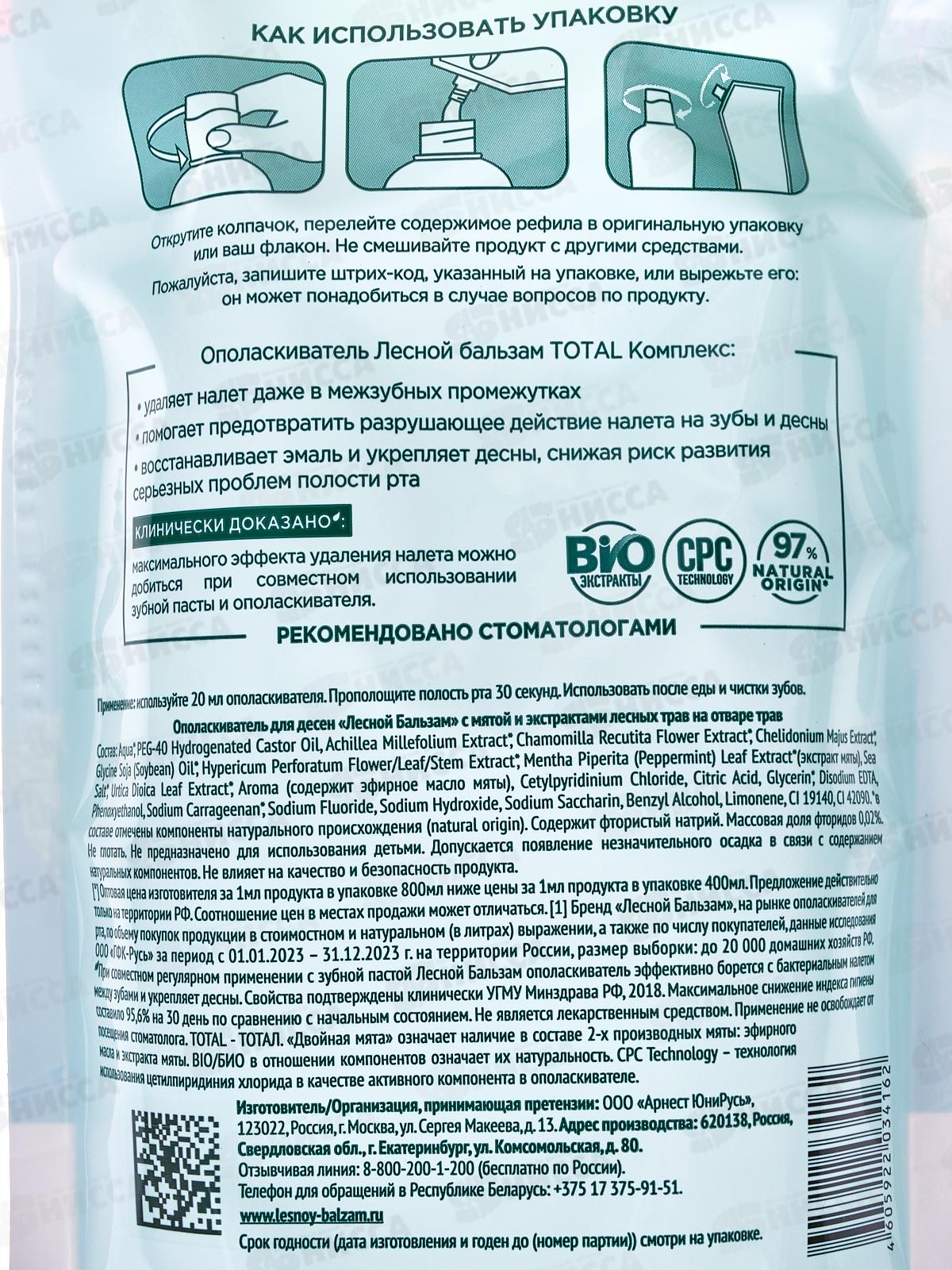 КК ЛЕСНОЙ БАЛЬЗАМ ополаскиватель для полости рта 800мл Total комплекс мята дой-пак *6