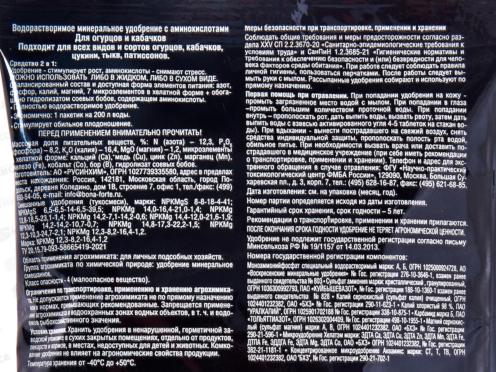 Компоненты: азот - 12,3%, фосфор - 8,2%, калий - 16,4%, магний - 1,2%