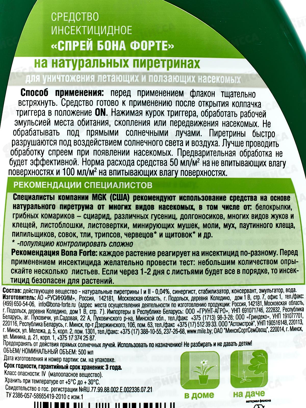 Средство можно использовать от: белокрылки, дрозофил (черных мушек), грибных комариков-сциарид, гусениц (моли, совки, листовертки), долгоносиков, златки, клопов, листоедов, ложнощитовки, минирующих мушек, многоножки, моли, мух, паутинного клеща, пилильщиков, совок, тли, трипсов, трубковерта, уховертки, цветоедов, червецов, щелкунов, щитовки. Состав: Действующее вещество: натуральные пиретрины I и II - 0,04%. Вспомогательные компоненты: синергист, стабилизатор, консервант, эмульгатор, вода.