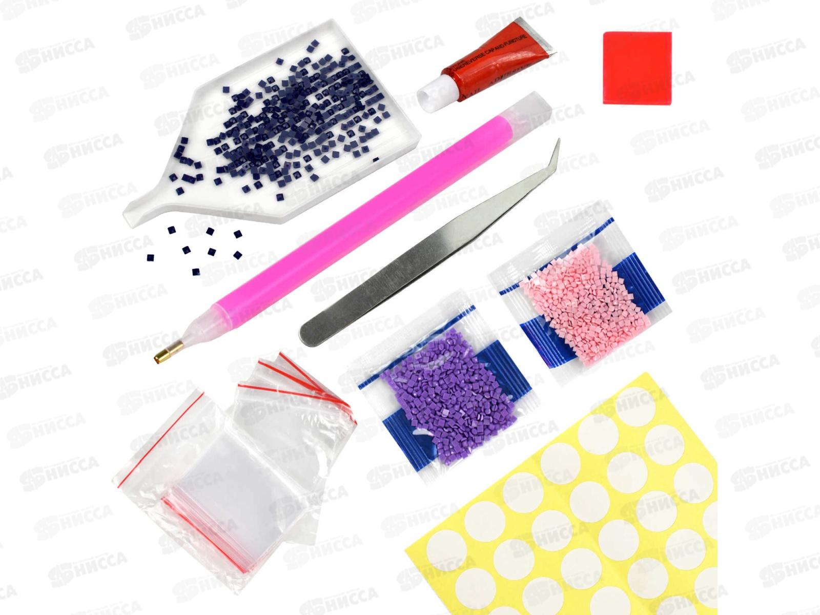 Комплектация: холст на подрамнике с напечатанной картиной, покрытый клеевым слоем и защитной пленкой, пакеты со стразами, стилус, лоток для страз, силикон для страз, клей, подвесы для подрамника, пинцет металлический, схема, дополнительные пакеты с zip-молнией, стикеры.