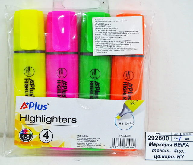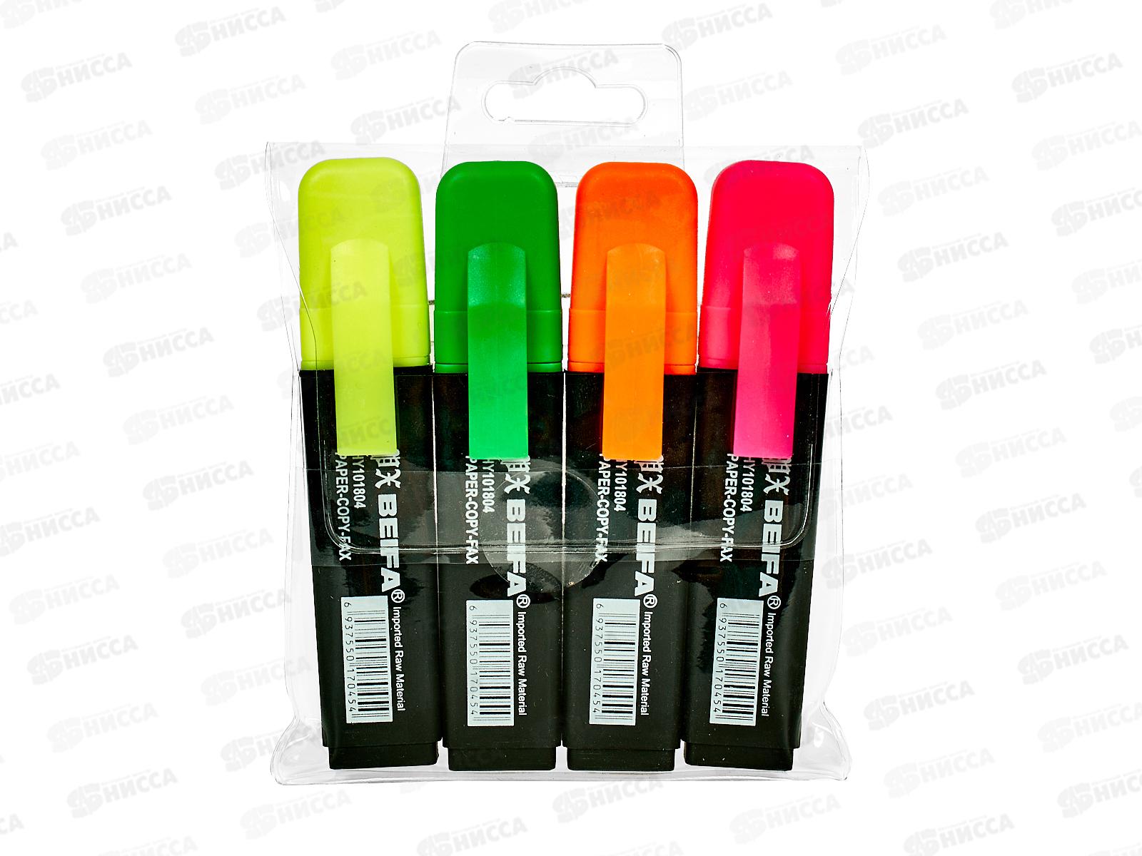 Код:445220; Маркеры BEIFA текстовый флюоресцентный 4 цвета (желтый, оранжевый, розовый, салатовый) 254400-4 *12/144