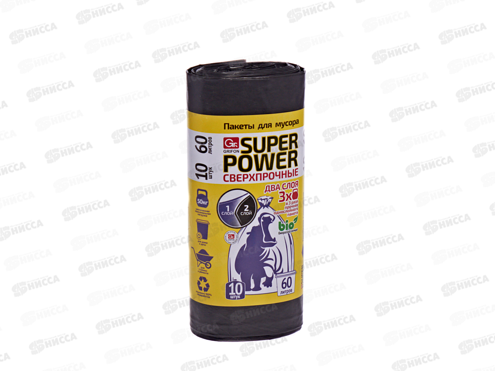 Код:400881; Пакеты для мусора GRIFON двухслойные особо прочные 60л 10шт рулон 101-090 *24