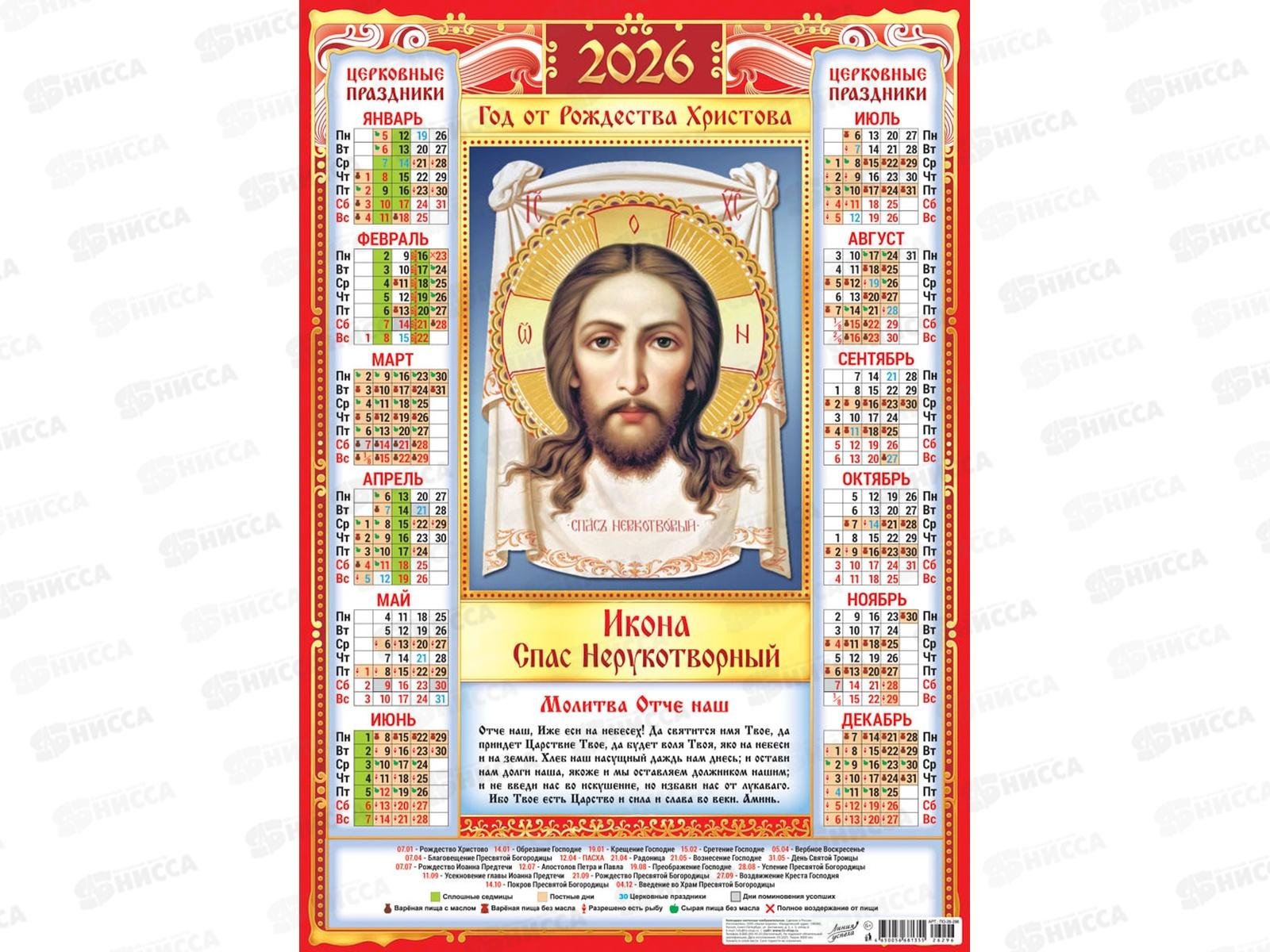 Код:584080; Календарь листовой 2026 А2 ЛиС Иконы. Спас (на красном), ПО-26-296 *100