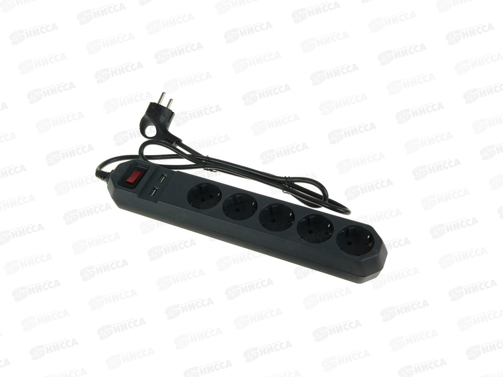 Код:153593; Сетевой фильтр ЭРА USF-5es-1.5m-USB-B с заземлением, с выключателем , 5 розеток + 2 USB 2.1А, 1.5м черный *20