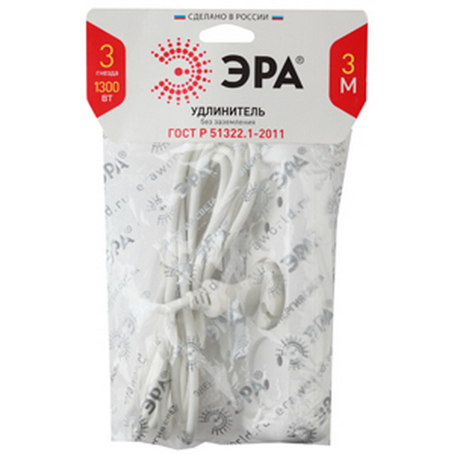 Удобный бытовой удлинитель ЭРА UX(6)-3-3m на 3 розетки, без заземления. Рассчитан на одновременное подключение к розетке до трёх маломощных электропри...