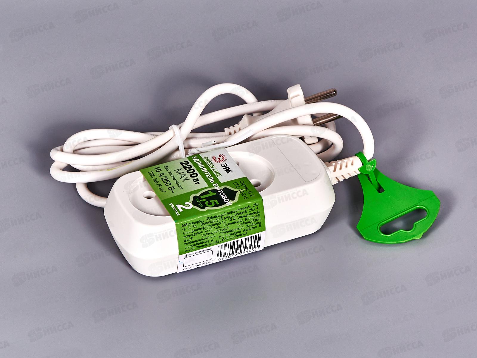 Удобный бытовой удлинитель ЭРА UX(6)-2-1,5m на 2 розетки, без заземления, провод 1,5 м, ПВС, 2x0,75мм2. Рассчитан на максимальную мощность 6А / 1300Вт...