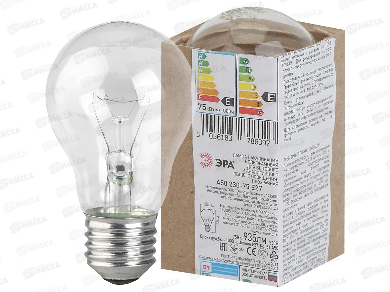 Код:134492; Электрическая лампочка 75 Вт ЭРА E27, А50 упаковка гофра *100