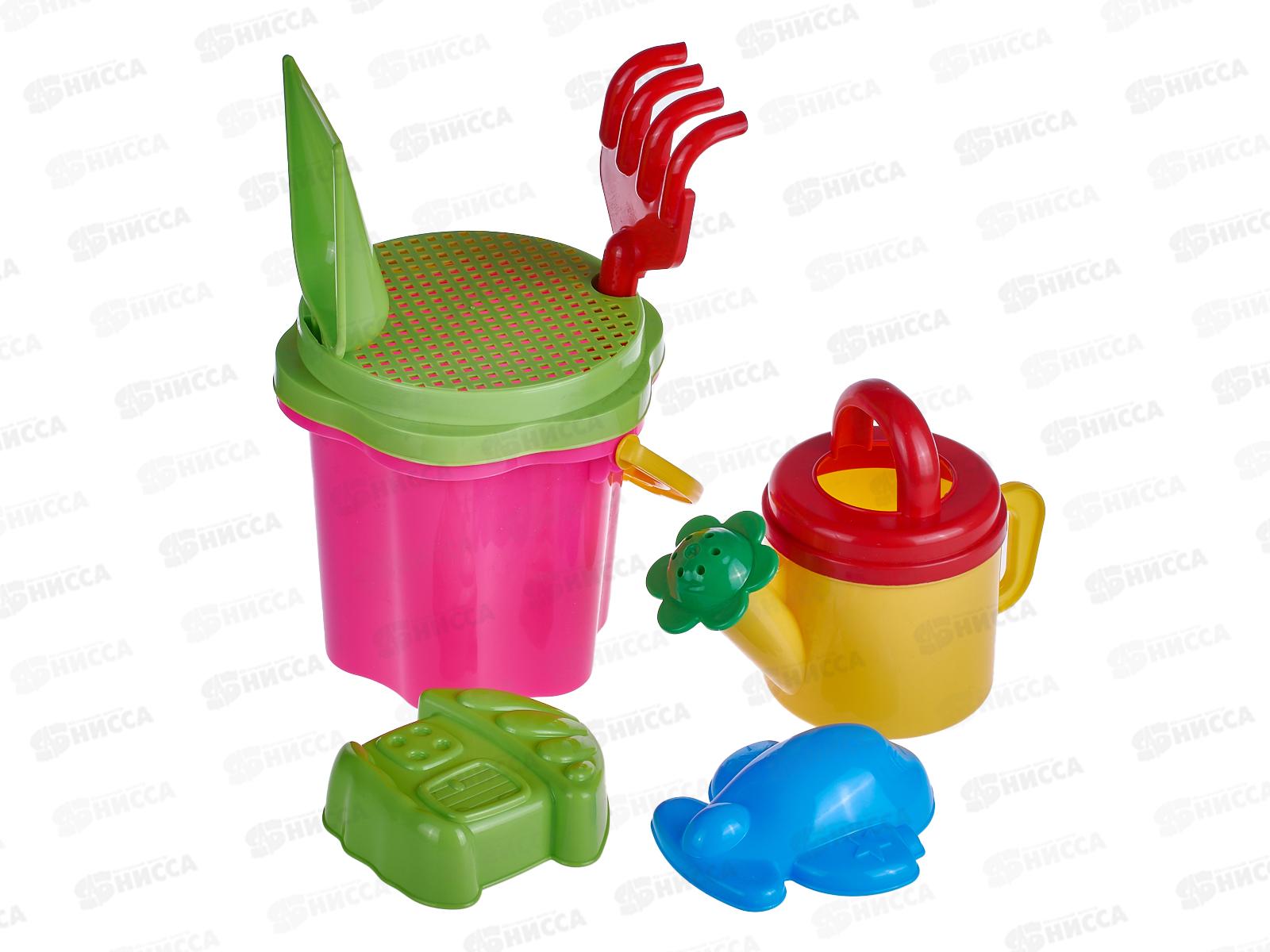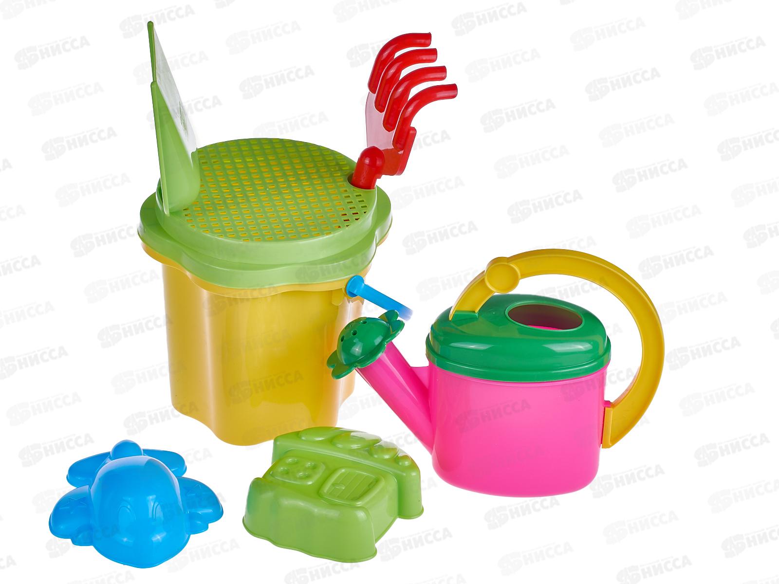 Код:474413; Набор песочный №109, 01809 (ведро-цветок 0,7л, сито, грабли 20см, совок 21см, 2 формочки, лейка 0,3л) *20