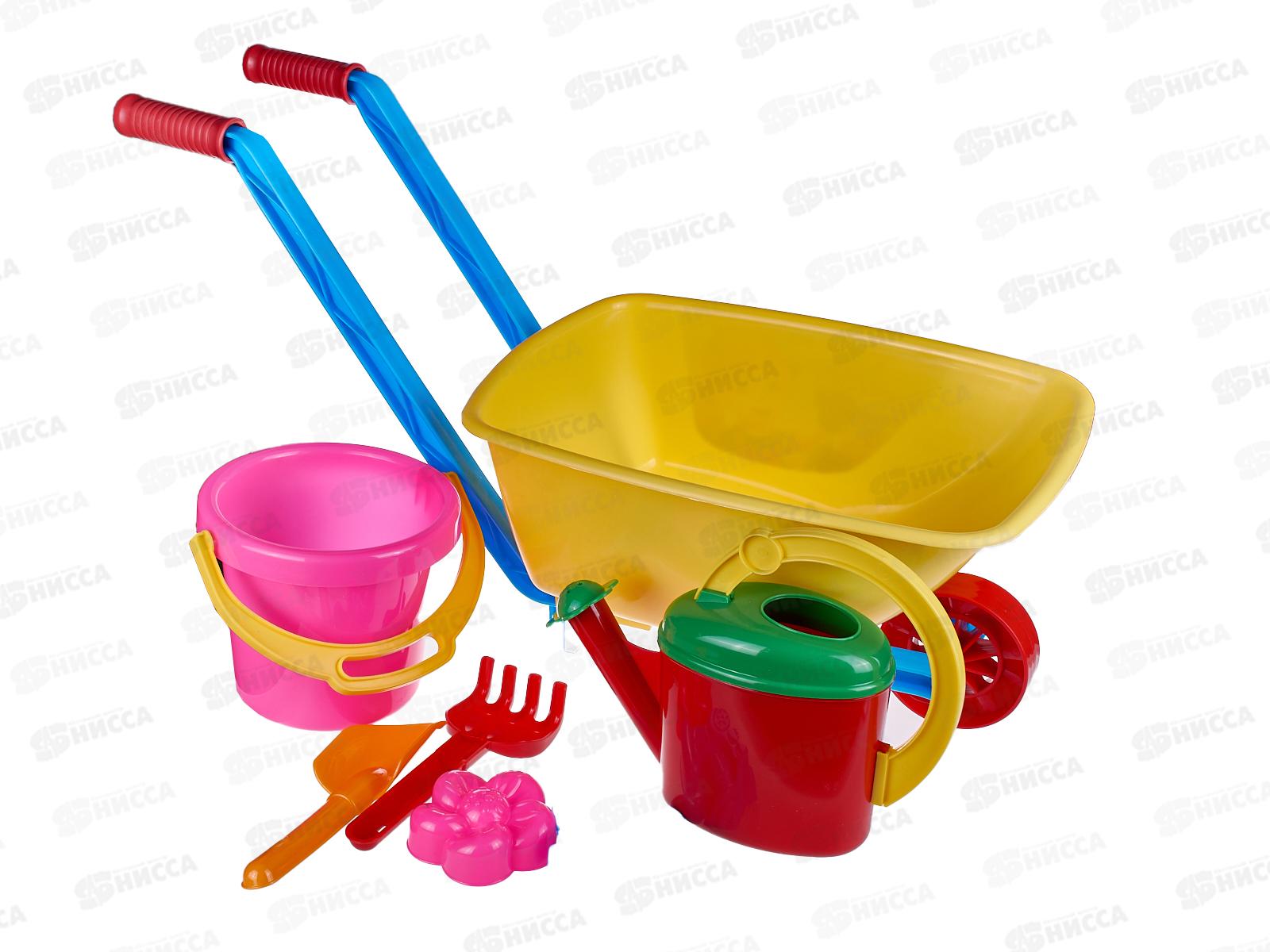 Код:474416; Набор песочный №113, 01813 (тачка, ведро 1,4л, лейка 0,8л, совок 19см, грабли 19см, 2 формочки) *2