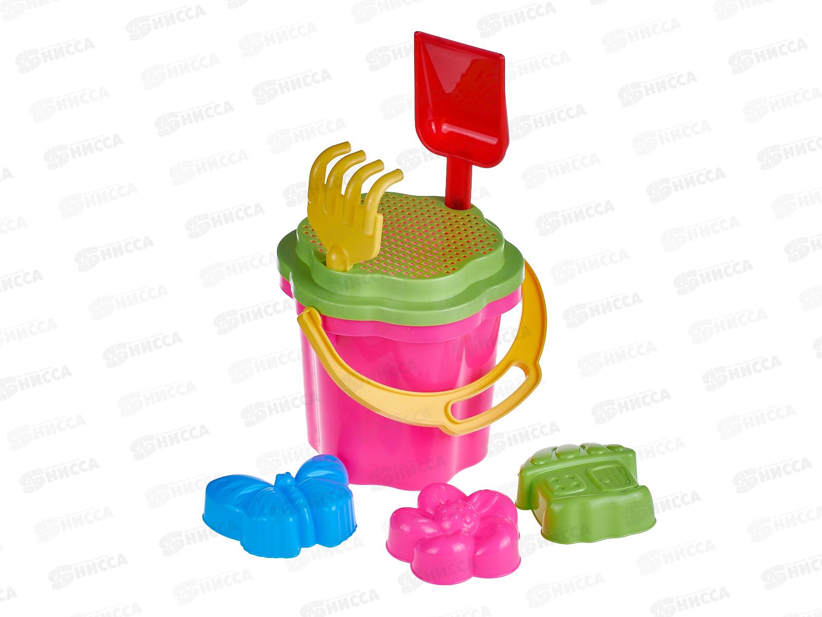 Код:474407; Набор песочный №103, 01803 (ведро-цветок 0,3л, сито, грабли, совок, 2 формочки) *55