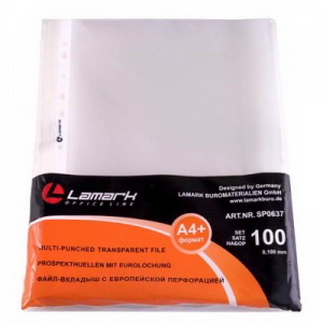 Характеристики:Торговая марка: LamarkАртикул: SP0067-ВТип товара: Файл - вкладыш (мультифора)Цвет: прозрачныйФормат: А4+Количество: 100 штПлотность: 3...