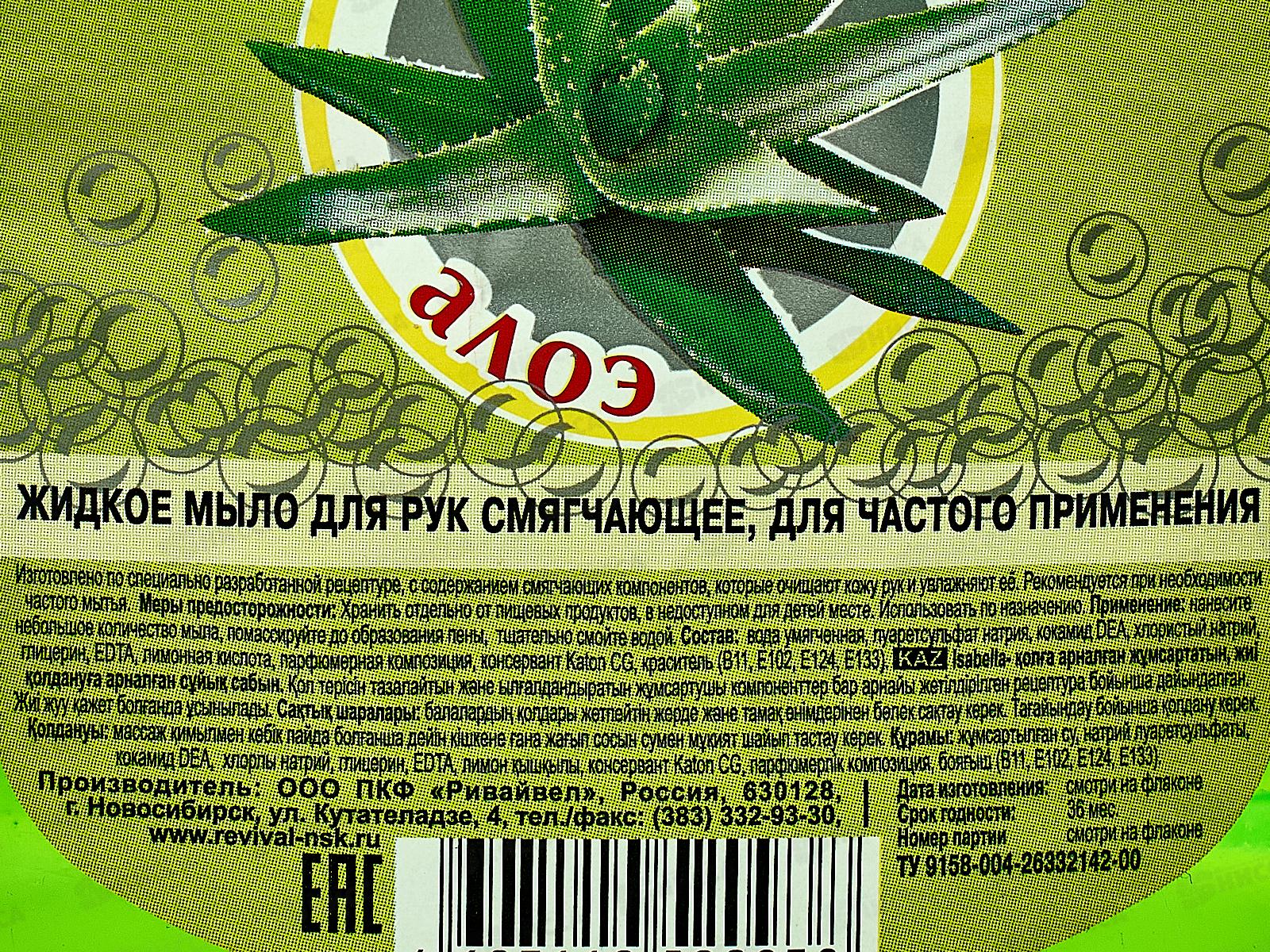 Состав: вода умягченная, композиция ПАВ (лауретсульфат натрия, диэтаноламид жирных кислот кокосового масла, бетаин) 10-15%, хлористый натрий, акриловый замутнитель SYNTRAN 5904, глицерин, парфюмерная композиция, EDTA, лимонная кислота, Aloe barbadensis Extract (экстракт алоэ), консервант CMIT-MIT, краситель.