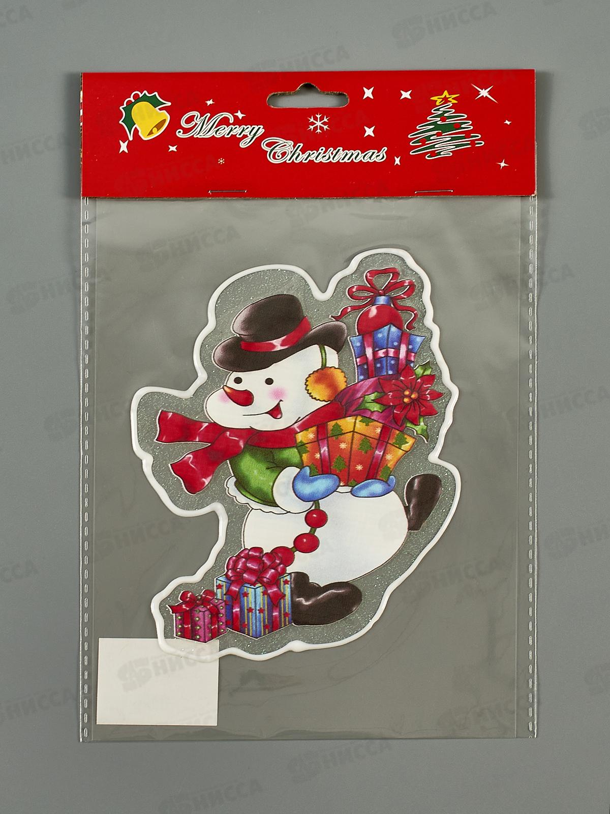 Код:586366; Наклейка на стекло "Снеговик с подарками" 15*20см 185-0790