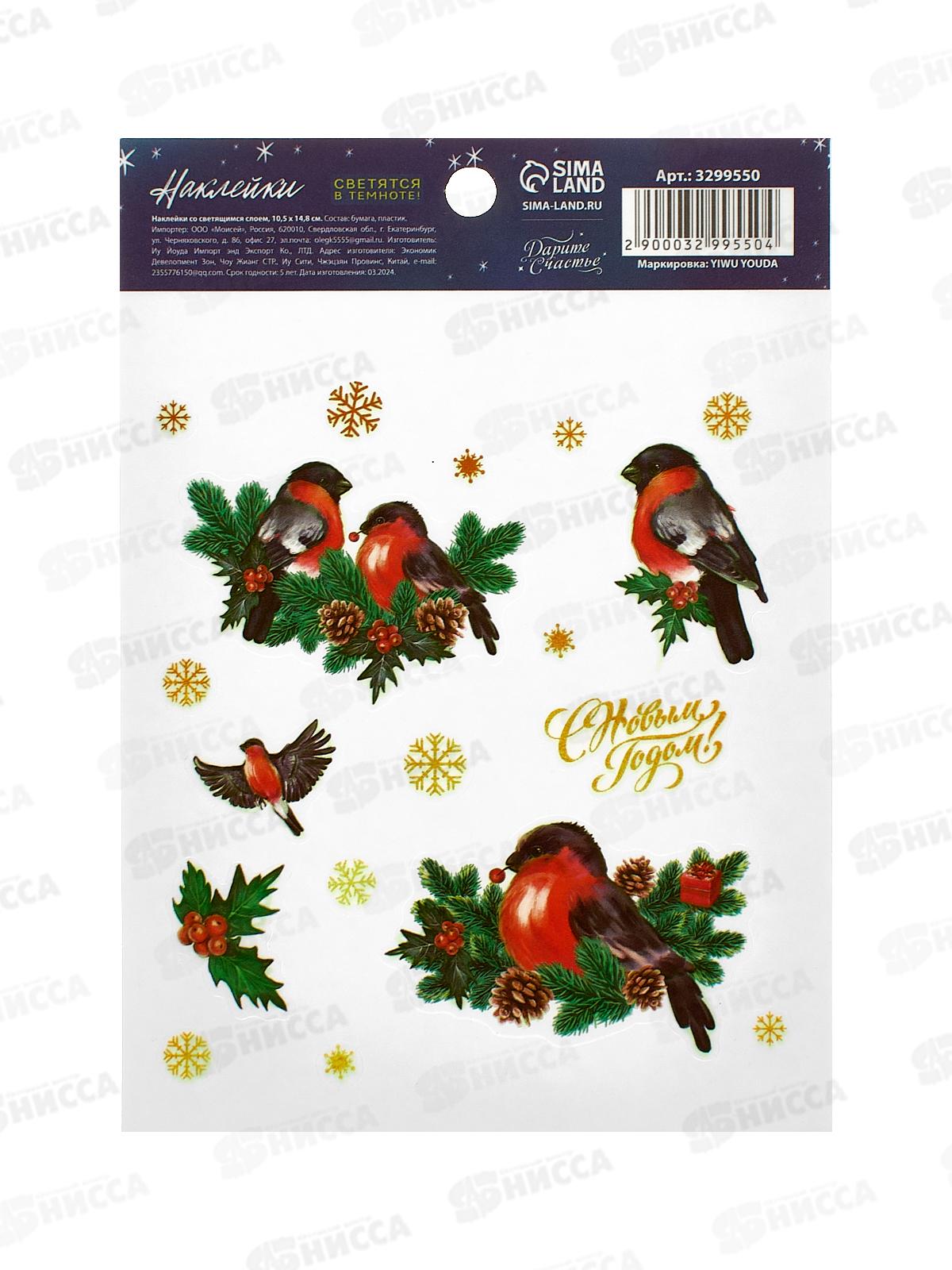 Код:588274; Наклейка на стекло "Снегири !" свет слой 10,5*14,8*0,1см 3299550