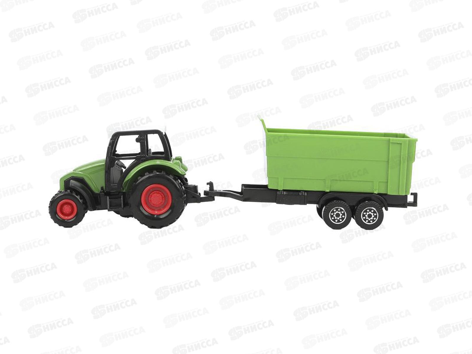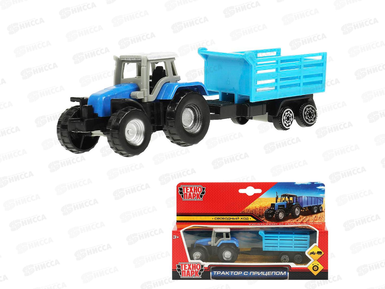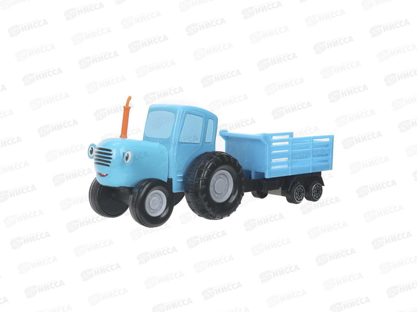 Код:592485; Машина "ТЕХНОПАРК" металл Синий Трактор 11см, с телегой и коровой, инерц., в коробке