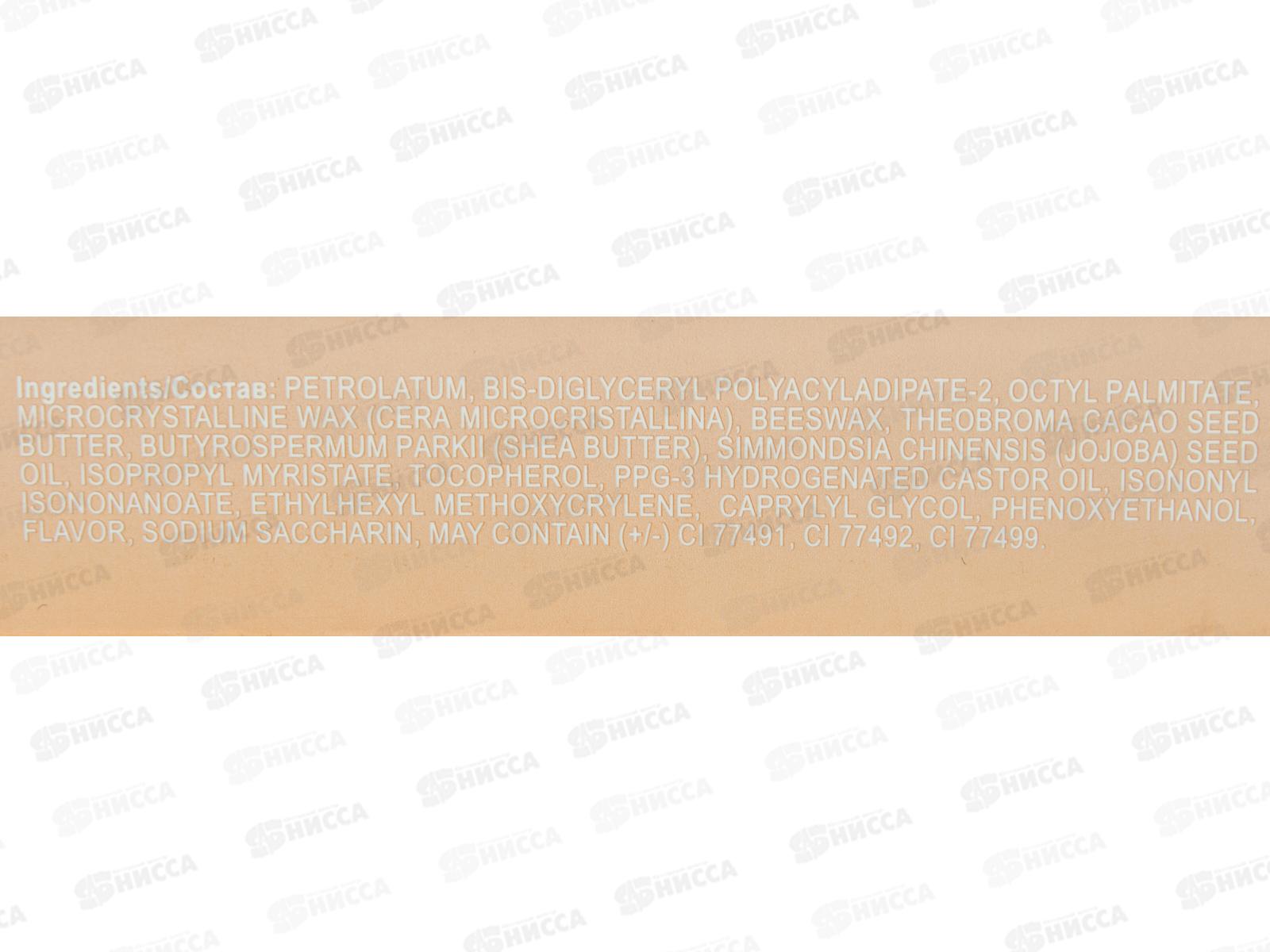 Состав: вазелин, бис-диглицерилполиациладипат-2, октилпальмитат, микрокристаллический воск (Cera Microcristallina), пчелиный воск, масло семян какао Theobroma, масло ши Butyrospermum Parkii, масло семян жожоба Simmondsia Chinese, изопропилмиристат, токоферол, гидрогенизированное касторовое масло PPG-3, изононилизононаноат, этилгексилметоксикрилен, каприлилгликоль, феноксиэтанол, ароматизатор, сахарин натрия, может содержать (+/-) CI 77491, 77492, C1 77499.