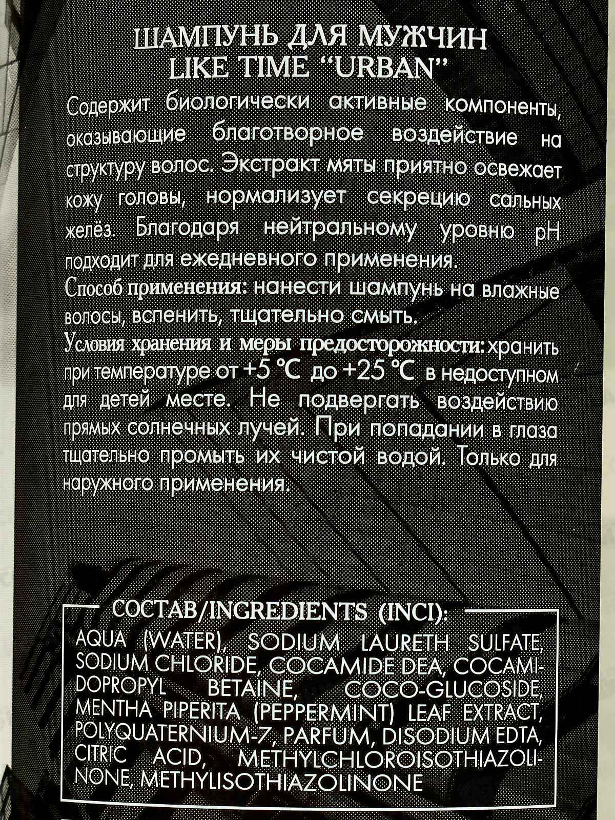 Состав: вода, лауретсульфат натрия, хлорид натрия, кокамид ДЭА, кокамидопропилбетаин, коко-глюкозид, экстракт листьев мяты перечной, поликватерниум-7, отдушка, динатрий ЭДТА, лимонная кислота, метилхлороизотиазолинон, метилизотиазолинон.