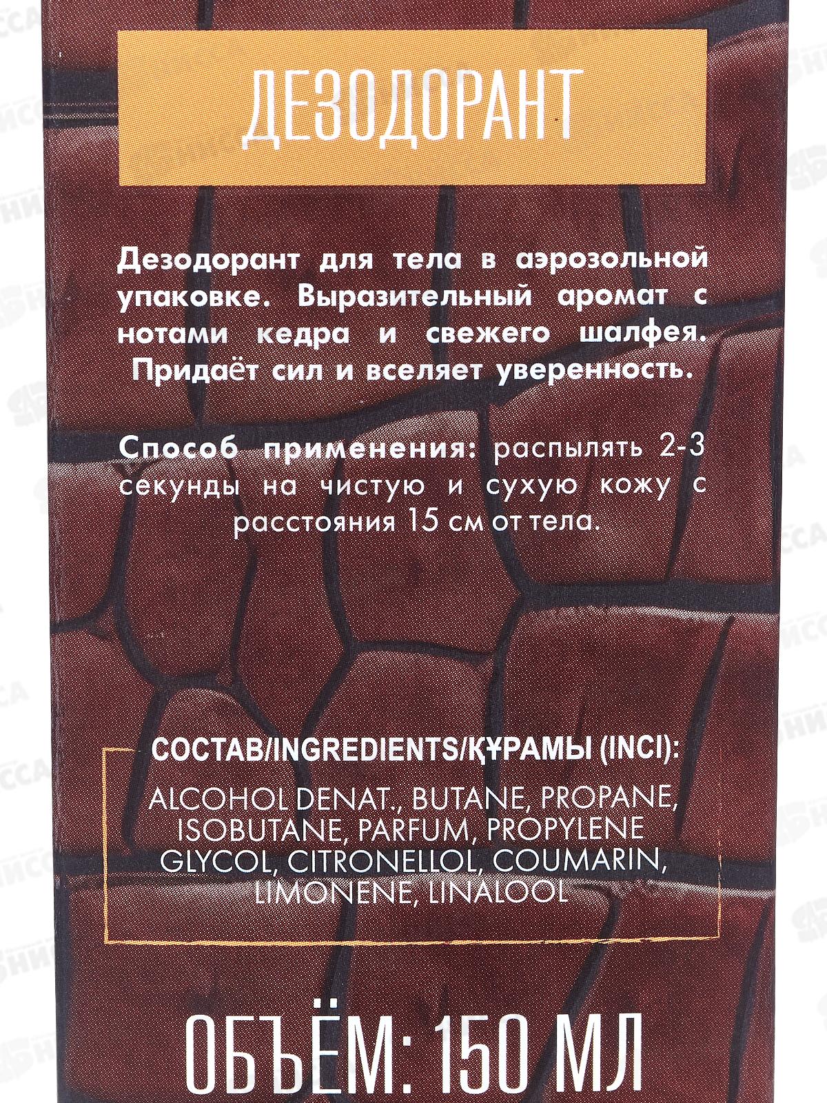 Состав дезодоранта: спирт денатурированный, бутан, пропан, изобутан, парфюмерная композиция, пропиленгликоль, цитронеллол, кумарин, лимонен, линалоол. Состав пены для бритья: вода, триэтаноламин, стеариновая кислота, изобутан, глицерин, пальмитиновая кислота, пропан, лауретсульфат натрия, поликватерниум-7, метилхлоризотиазолинон (и) метилизотиазолинон, парфюмерная композиция, бутан, аллантоин, экстракт листьев алоэ вера, линалоол.