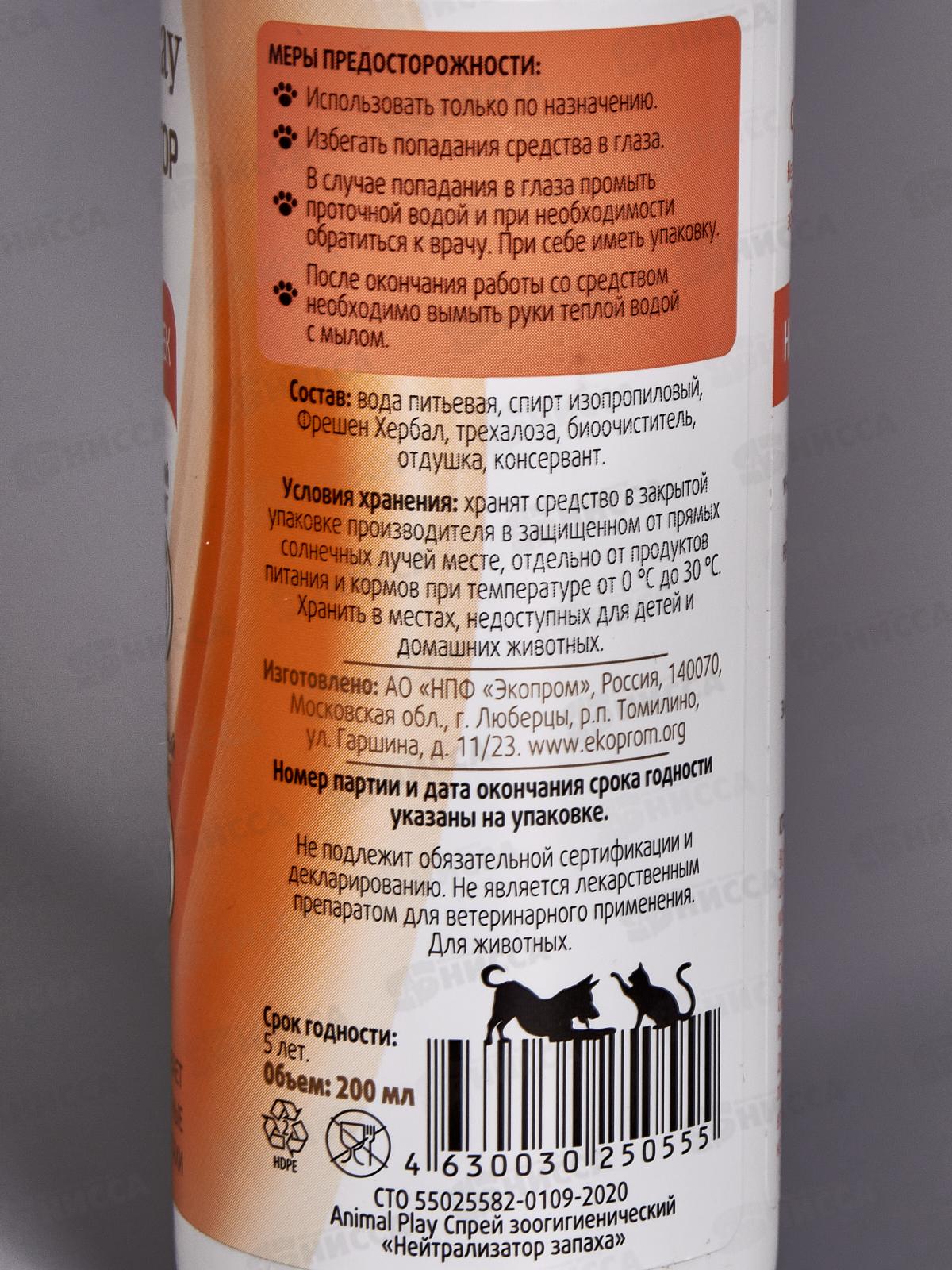 Animal Play Спрей зоогигиенический Нейтрализатор запаха для собак и кошек 200мл *12