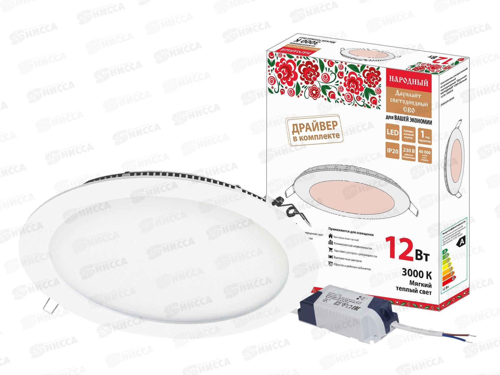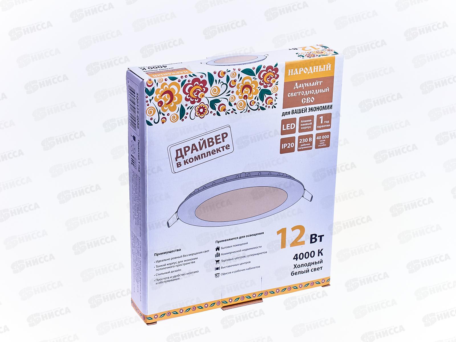 Код:566979; Светильник светодиодный СВО 12Вт 3000К белый "Даунлайт" Народный, 0095 *40