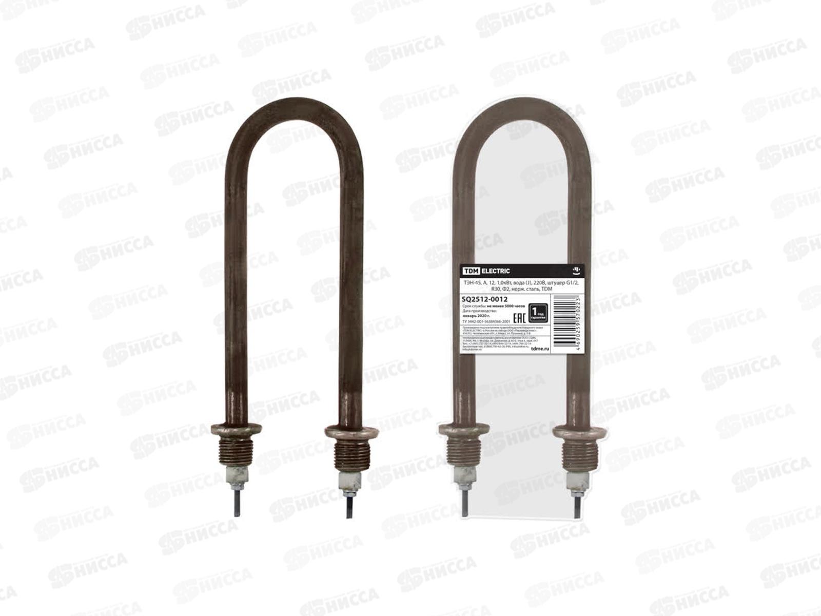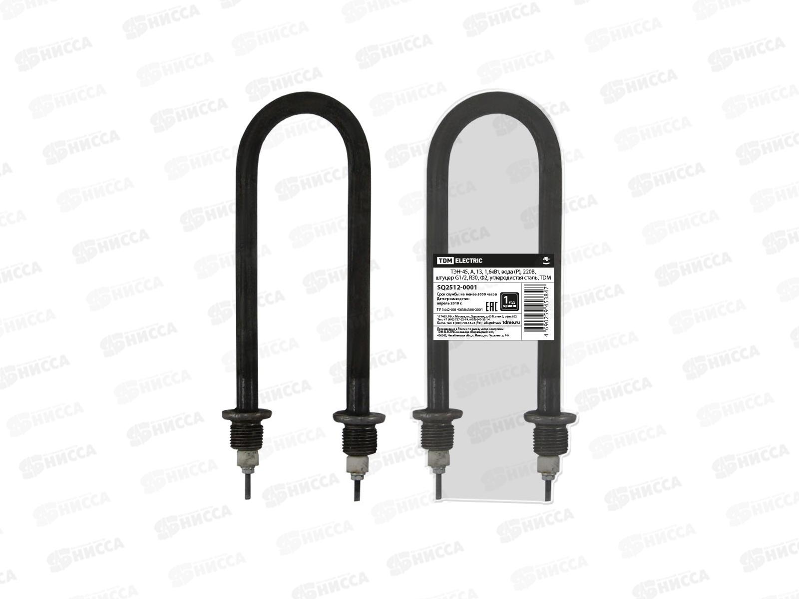 ТЭН TDM 45, А, 13, 1.6 кВт, вода (Р), 220В, штуцер G1/2, R30, Ф2, углеродистая сталь SQ2512-0001 применяется в водонагревателях, кипятильниках, котлах...