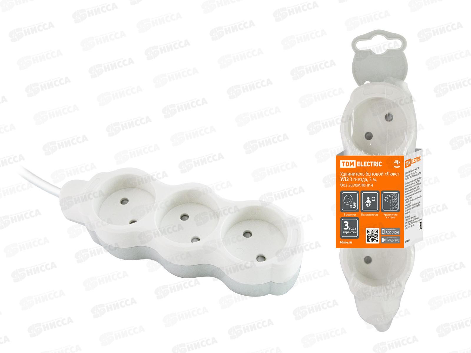 Код:466626; Удлинитель бытовой "Люкс" УЛ3 3 гнезда, 3м, без заземления, с защитной шторкой, ПВС 2х0,75 мм2 10А/250В бело-серый TDM, 0224 *20
