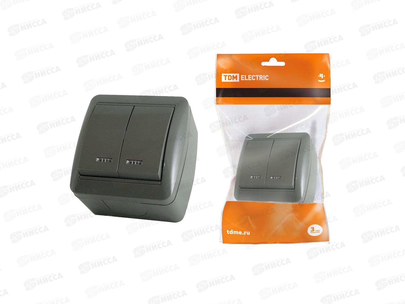 Код:395644; Выключатель TDM 2 клавиши открытая установка, подсветка, IP20 10А серый "Селигер", 0104