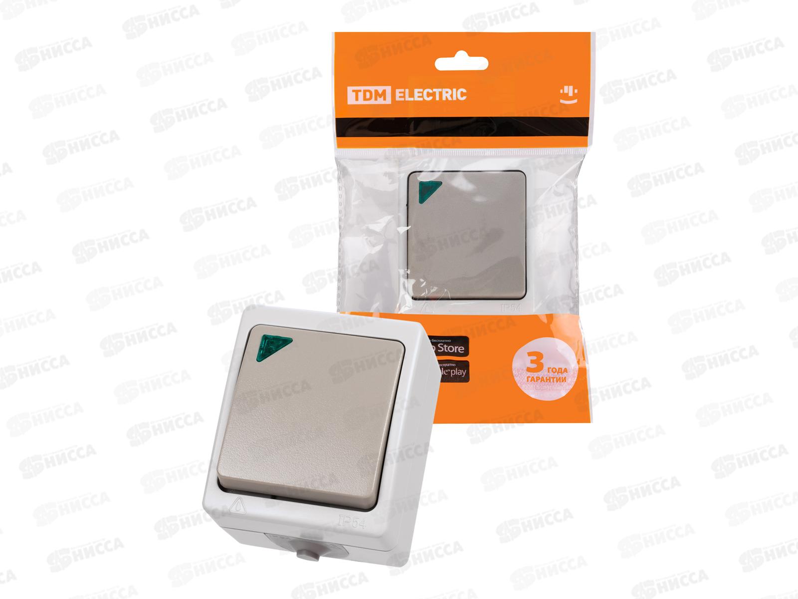 Код:395634; Выключатель TDM 1-клавиша открытая установка, подсветка., IP44 10А серый, "Селигер", 0103 *10
