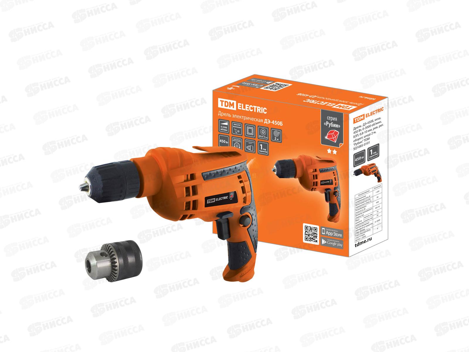 Код:408077; Дрель ДЭ-450Б, 450 Вт, 0-3000 об/мин, БЗП, шнур 2м, Рубин TDM 0101