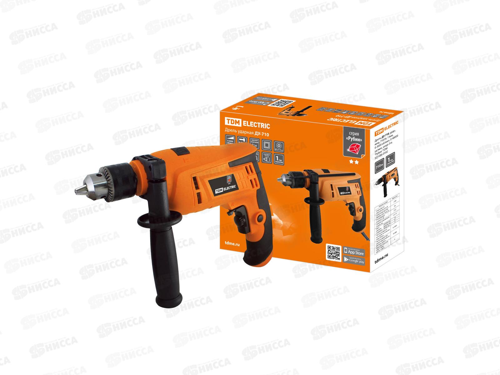 Код:408078; Дрель ударная ДУ-710, 710 Вт, 0-3000 оборотов в минуту, 0-48000 уд/мин,3м, Рубин TDM 0102